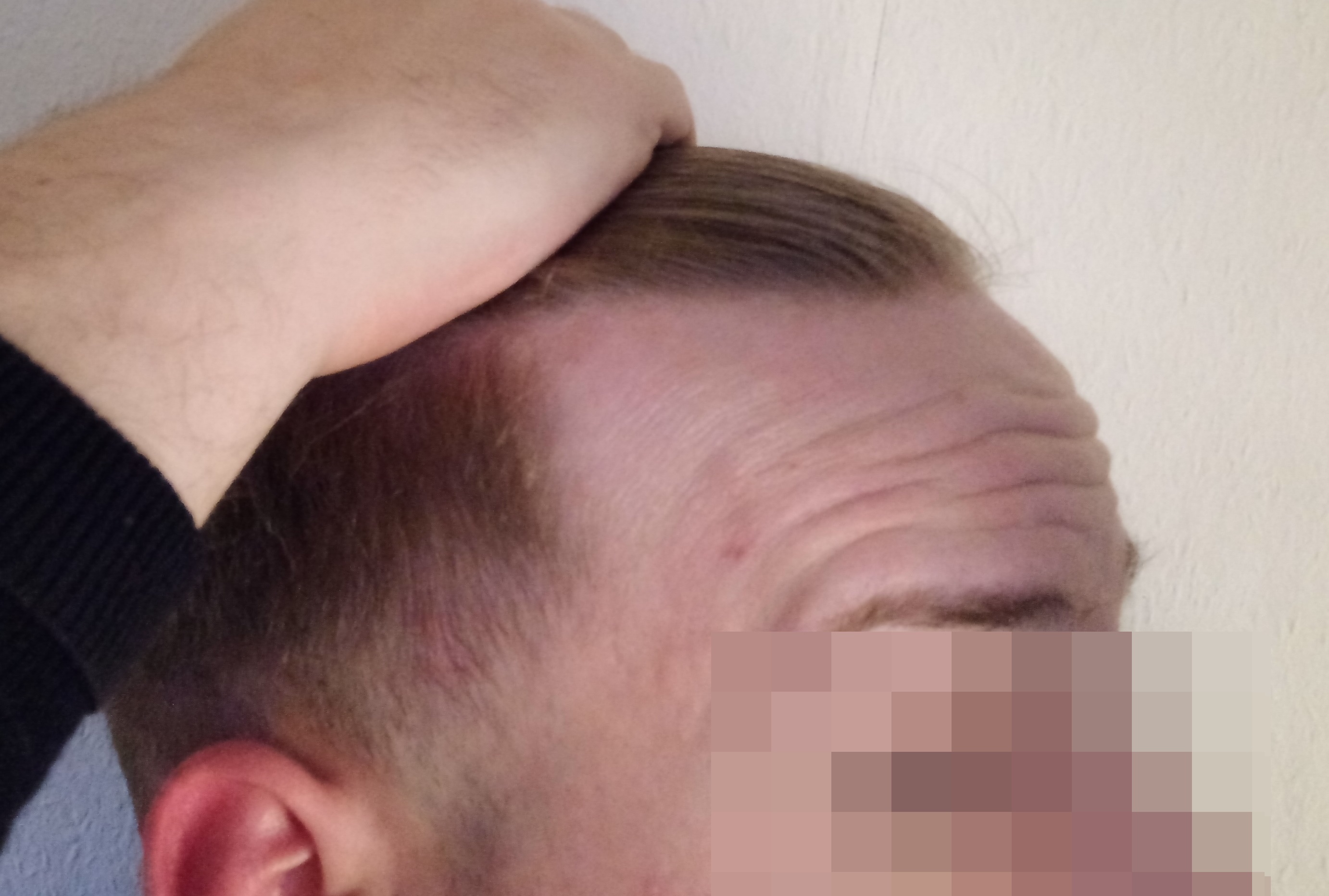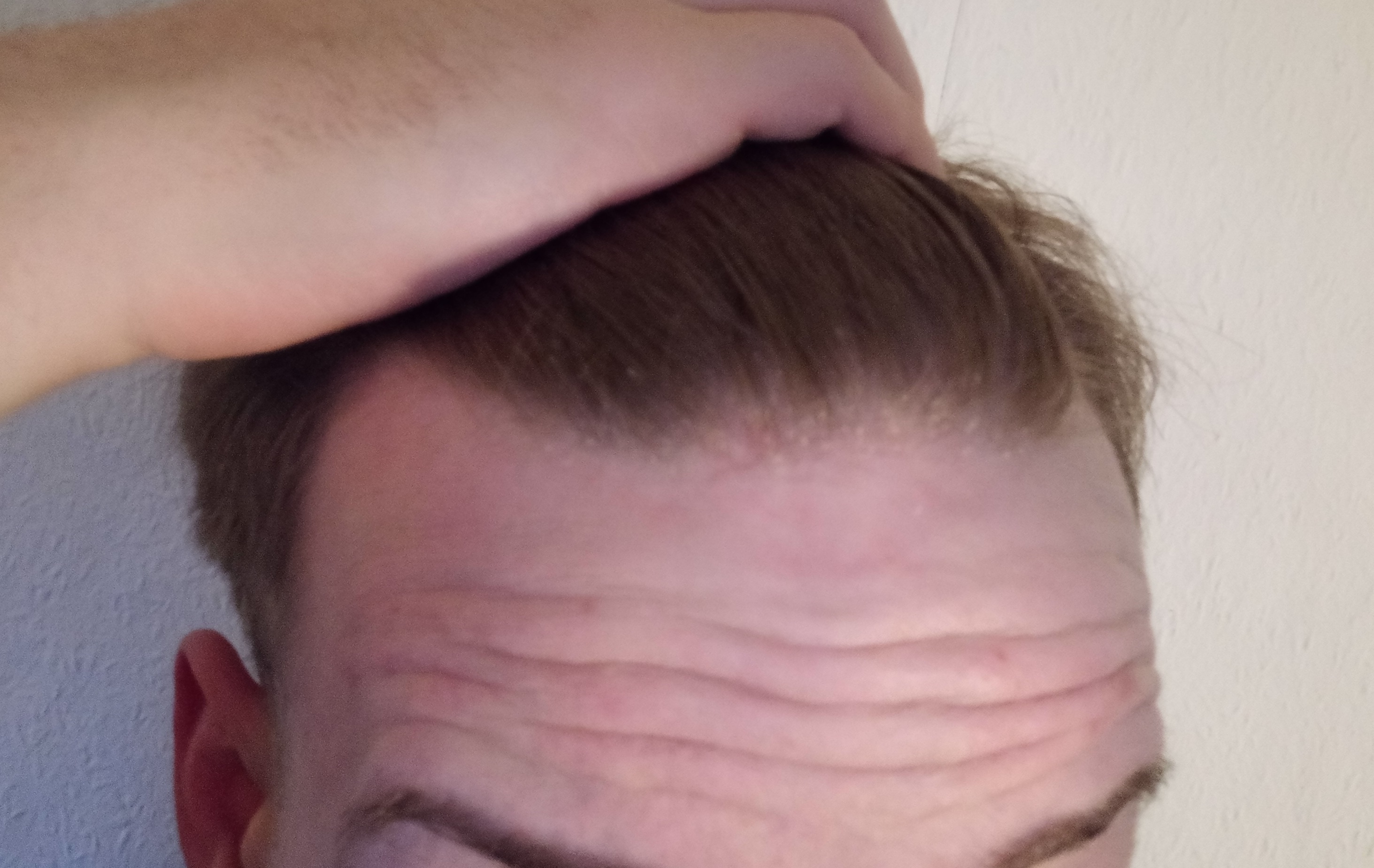 Kahl sind bisher keine Stellen, die Geheimratsecken dünnen aber wieder stark aus und ich kann keinen Unterschied zu den Seiten fühlen, die am dichtesten sind. Die Haut ist an der ganzen Kopfhaut und Stirn geringfügig zwickbar, es entsteht dabei nur eine minimale Hautfalte, wenn überhaupt.