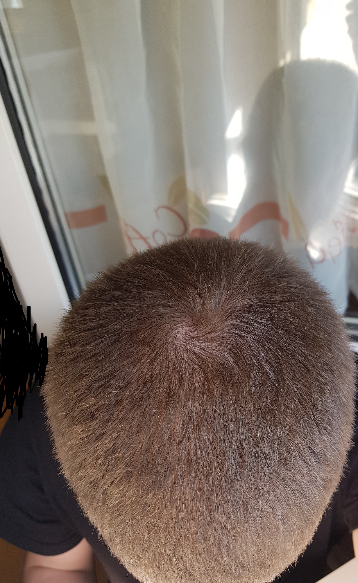 Da ging noch nicht die Axt im Walde um, aber ich finde schon, dass der Abstand zwischen den Terminalhaarschäften im Scheitelbereich größer ist, als dass bei der generellen Haardichte der Fall sein sollte. Beobachten.