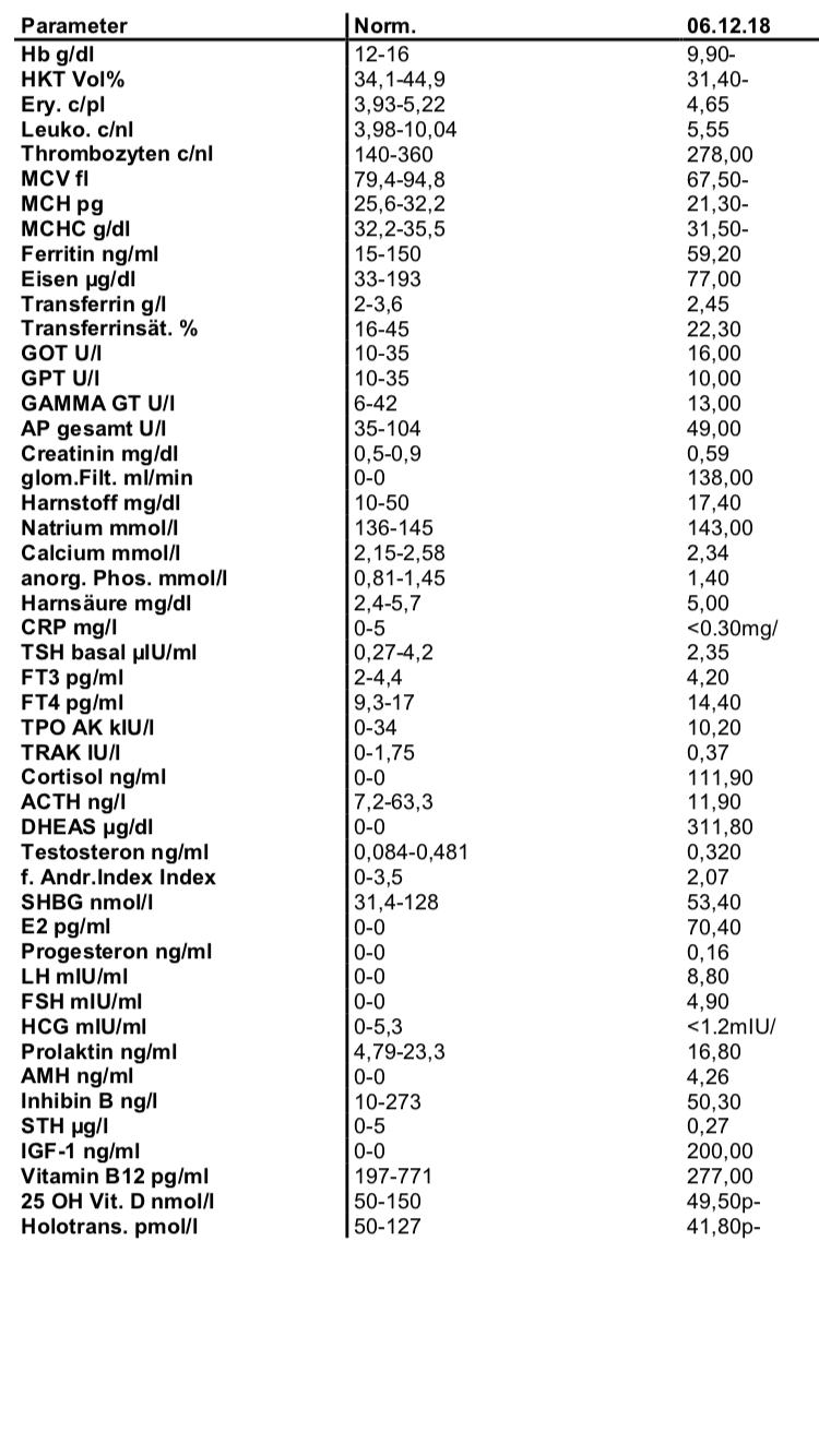 Außerdem natürlich die Schilddrüsenwerte, allerdings gehe ich davon aus, dass alles passt, wenn die "Hormonwerte" passen.