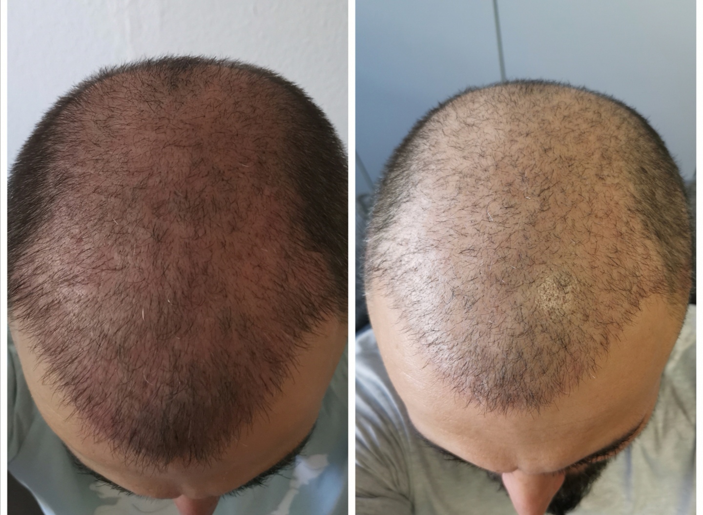 Hi Freunde. Heute sind es exakt post 4 Wochen. Das linke Bild ist heute direkt nach dem 0.5er Needling entstanden. Ich kann am Vertex und an den GHE's deutliche Änderungen sehen und spüren. Ich fühle und sehe viele Vellus Haare die bereit sind ihre Daseinsberechtigung bestreiten wollen. Ich hoffe auch dass diese genauso hartnäckig sind wie ich. Ich werde a.j.F. 12 Monate lang täglich needlen wie in der Signatur. Was ich noch in der Signatur ändern muss (aus Zeichengründen) ist, dass ich vor dem needlen die Pilos KET Lotion immer aufsetze bevor es ans needlen geht, weil m. M. n. ich so auch vorher den Kopf reinige bevor ich needle, also täglich und Pilos schwört ja auf KET, daher möchte ich das so beibelassen, vor allem wegen der Antiandrogene Wirkung von KET, weil ich jetzt 3 Absagen von Ärzten bekommen habe welche mir kein FIN verschreiben wollten (diese wollte ich auch nur ins Minox beimengen und topisch anwenden) daher die tägliche Anwendung des KET Lotions täglich 30-60 Minuten. Desweiteren habe ich xWannes Strategie kopiert und nach Pilos Empfehlung vorangegangen das ich Minox oral mit Vodka 1ml morgens einnehmen. Abends dann mit Okklusion topical. Alle 2-3 Tage Diclo Lösung (so gut es geht auch mit Okklusionverfahren).