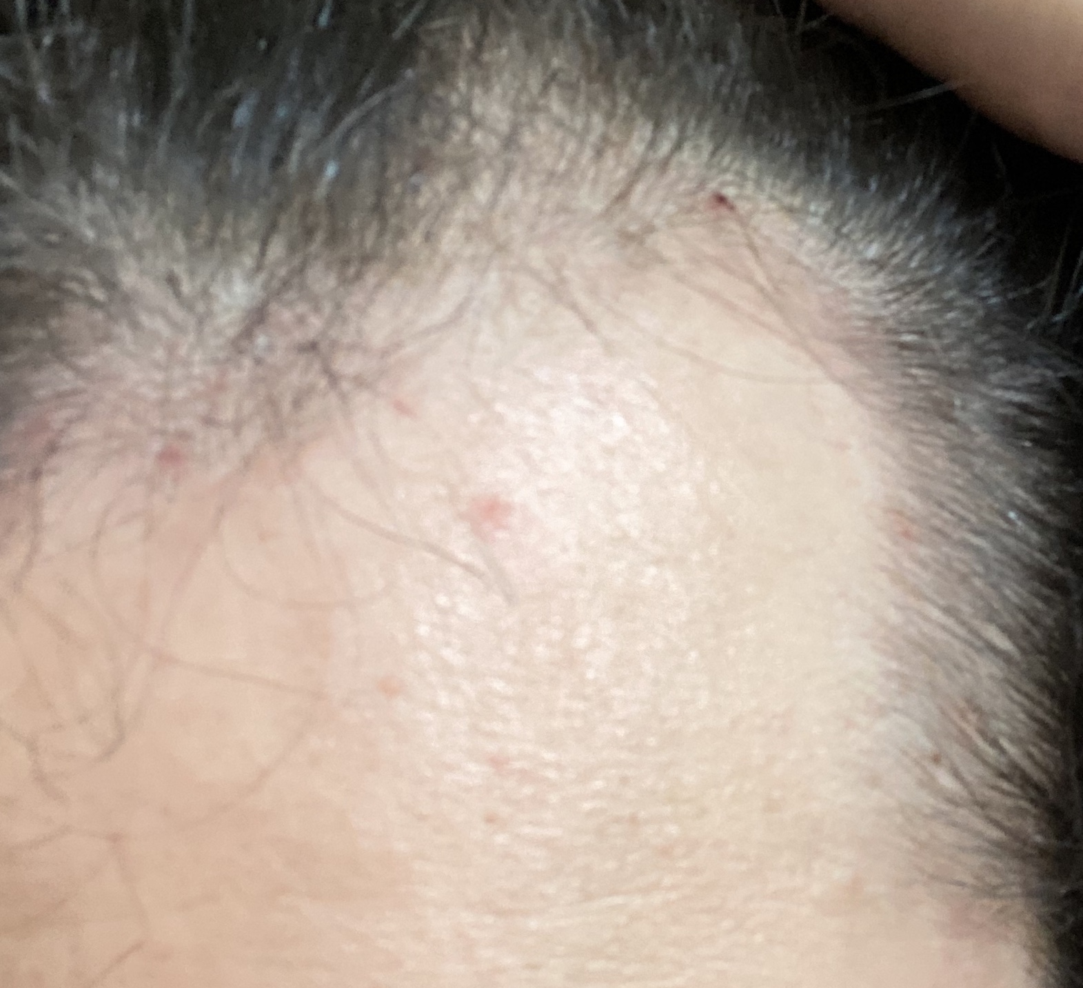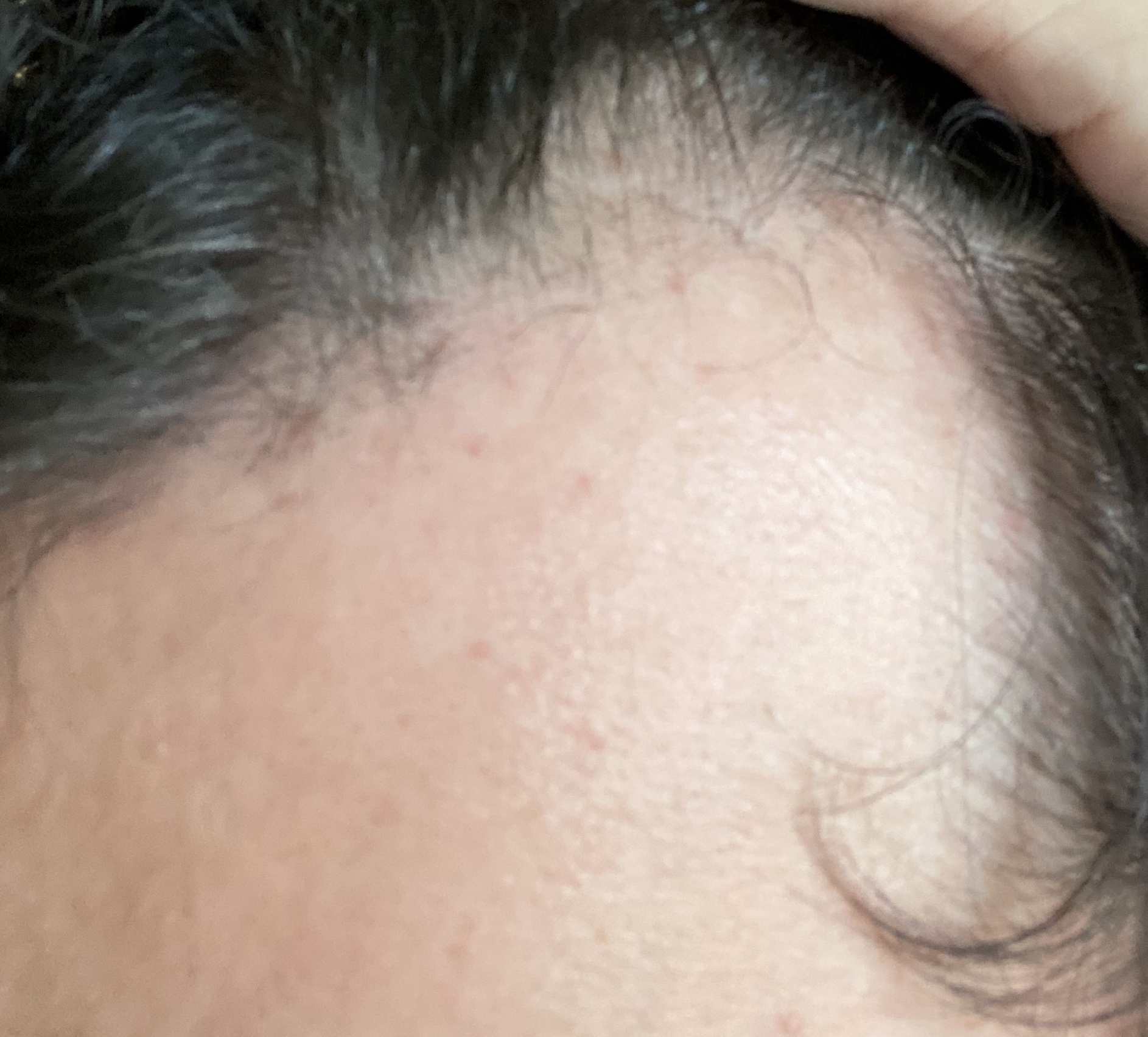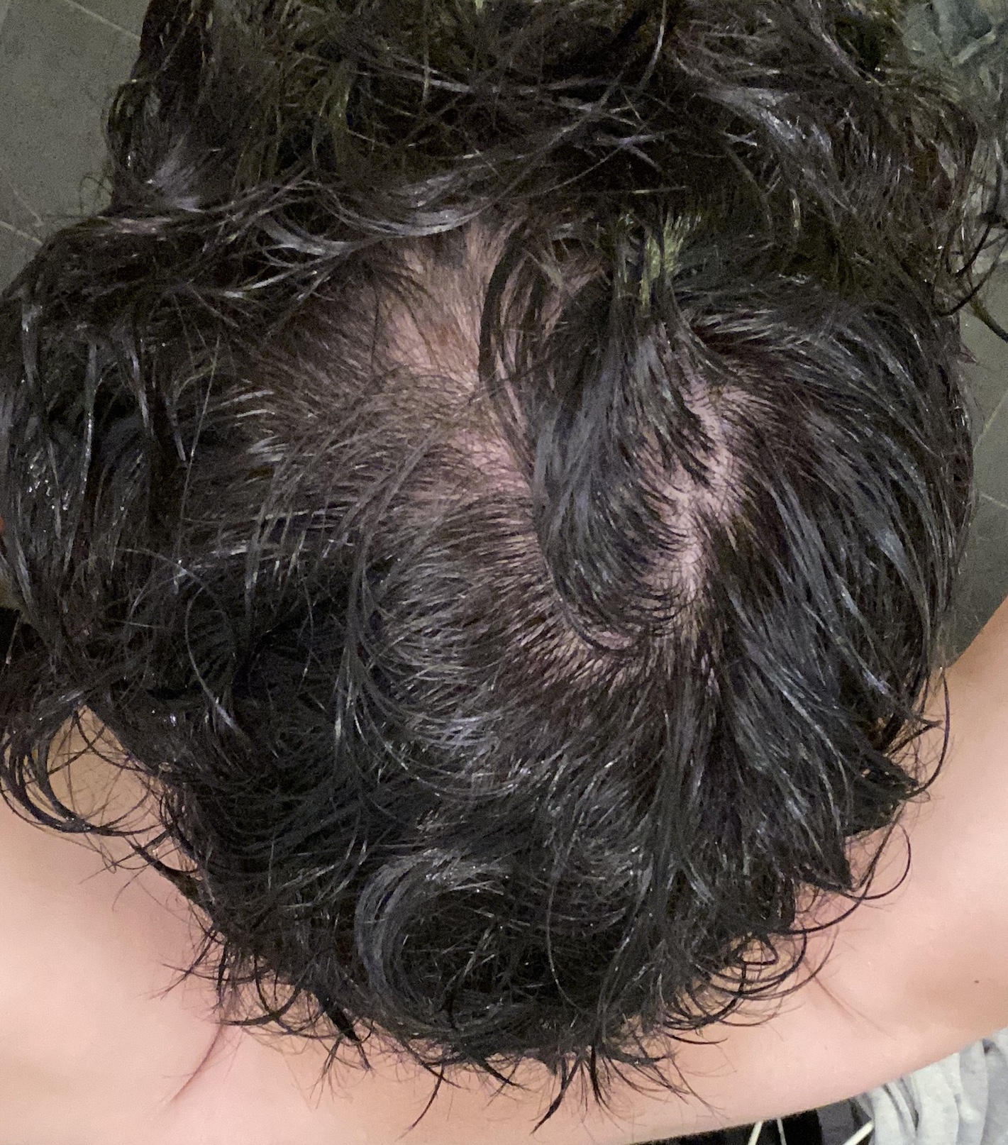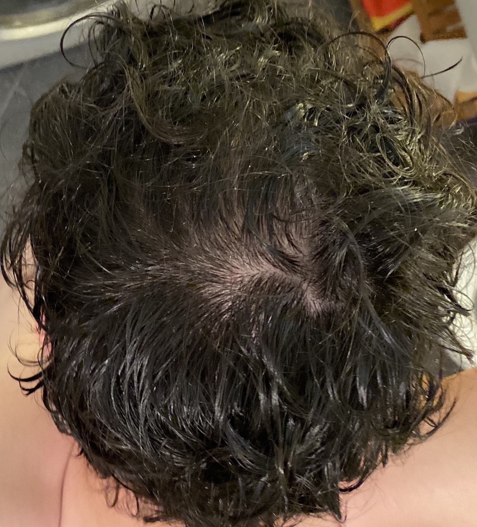 Anbei auch noch 2 Bilder meines Tonsurbereichs, beide im selben Bad unterm selben Licht aufgenommen, beide mit klatschnassen Haaren direkt aus der Dusche. Eines von vor knapp nem Monat, eines von heute.
