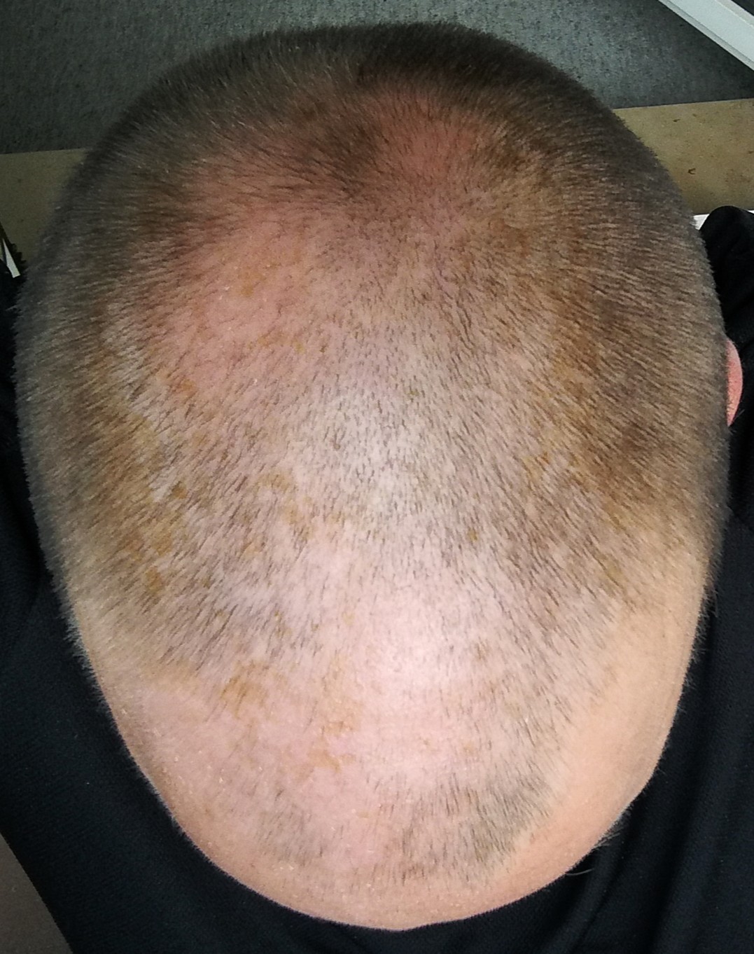 Ist das überhaupt (nur) richtige AGA? Der Verlauf der Lücken sieht ja doch etwas komisch aus, gerade hinter der Haarlinie. Vor allem, weil die Tonsur auch weit oben und nicht mittig ist.