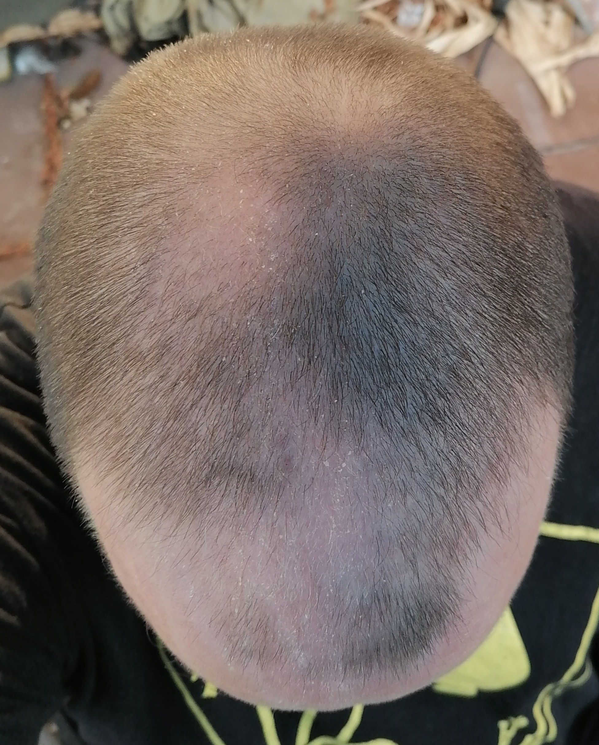 Ich musste jetzt auf Minox Liquid umsteigen, da der Schaum zu schnell leer war. Ich habe meine Haare auf 3 mm gekürzt, deshalb sieht das ein bisschen nach Shedding aus. Es hat sich aber an dem Status jetzt seit 1,5 Monaten nichts geändert. Weiter gehts...