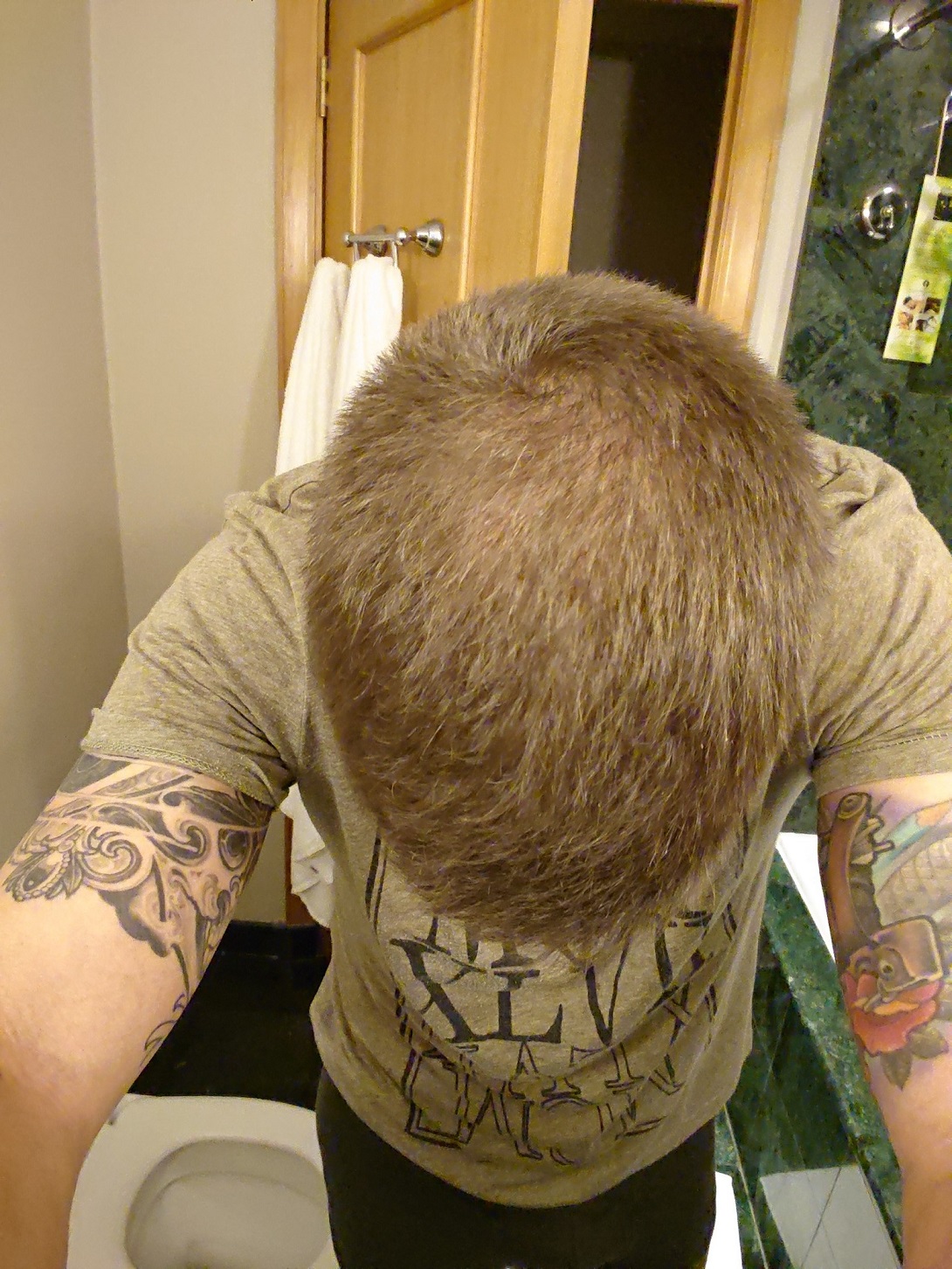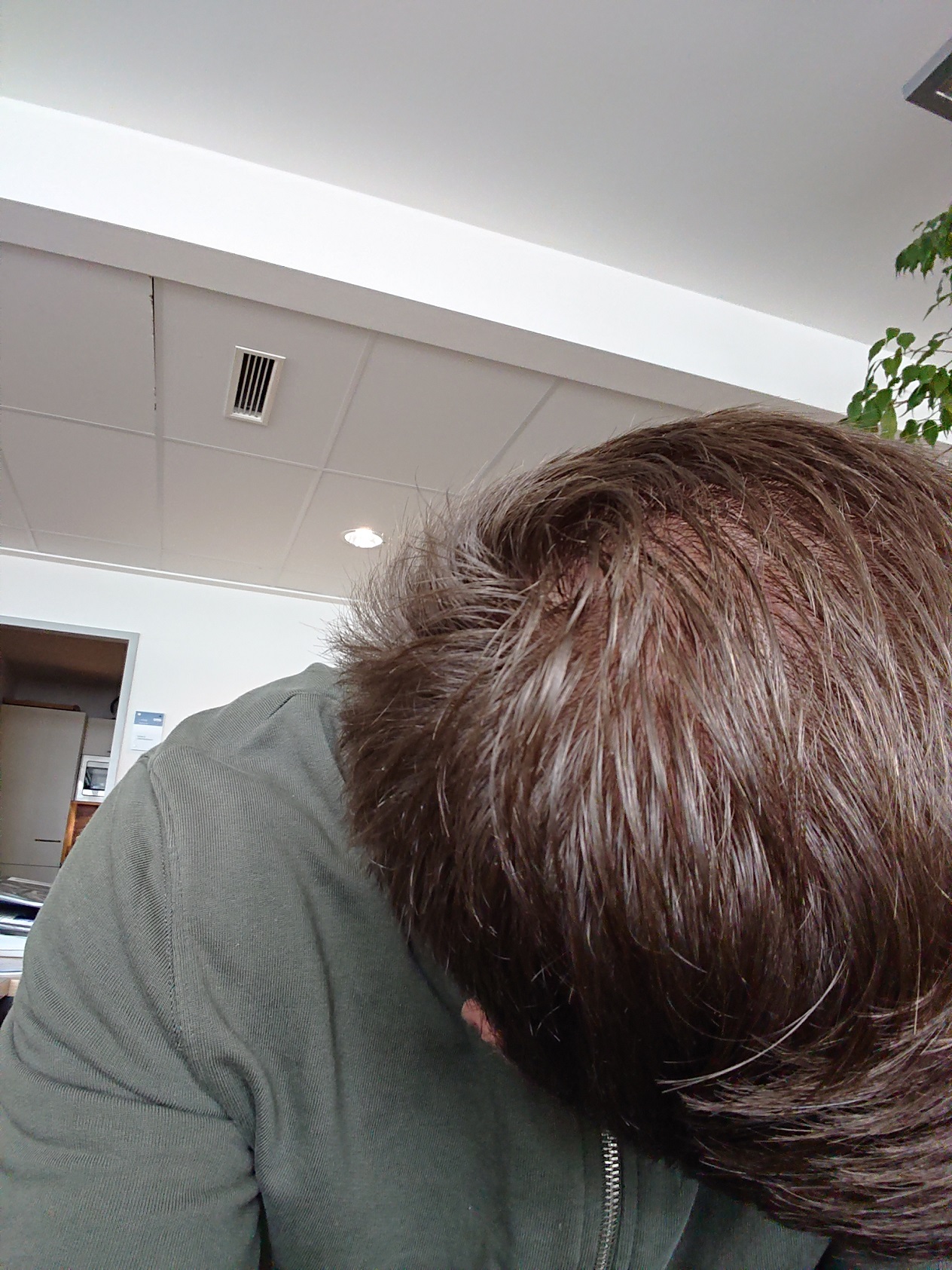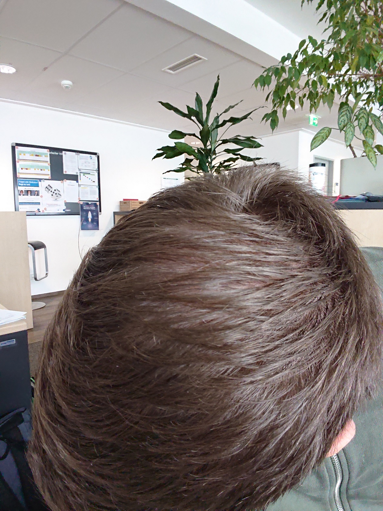 Witzig ist, dass wir auch noch einen ähnlichen Haarstatus haben. Front einigermaßen Konstant und vom Wirbel her eine voranschreitende Lichtung.