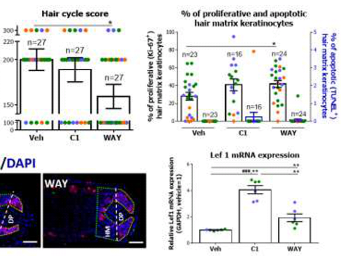 # This study demonstrates for the first time that the Wnt pathway and its regulatory agonists, antagonists and target genes are expressed in the human telogen-to-early anagen transformation.