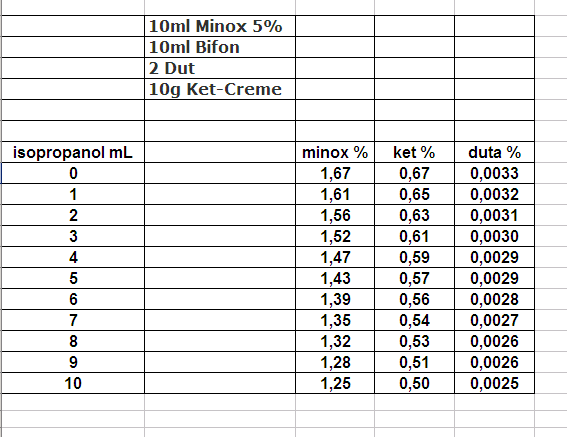 z.B. 2 Dut in 20ml lösen und Minox mit Ket 7:3 und von beiden jeweils 2ml auftragen.