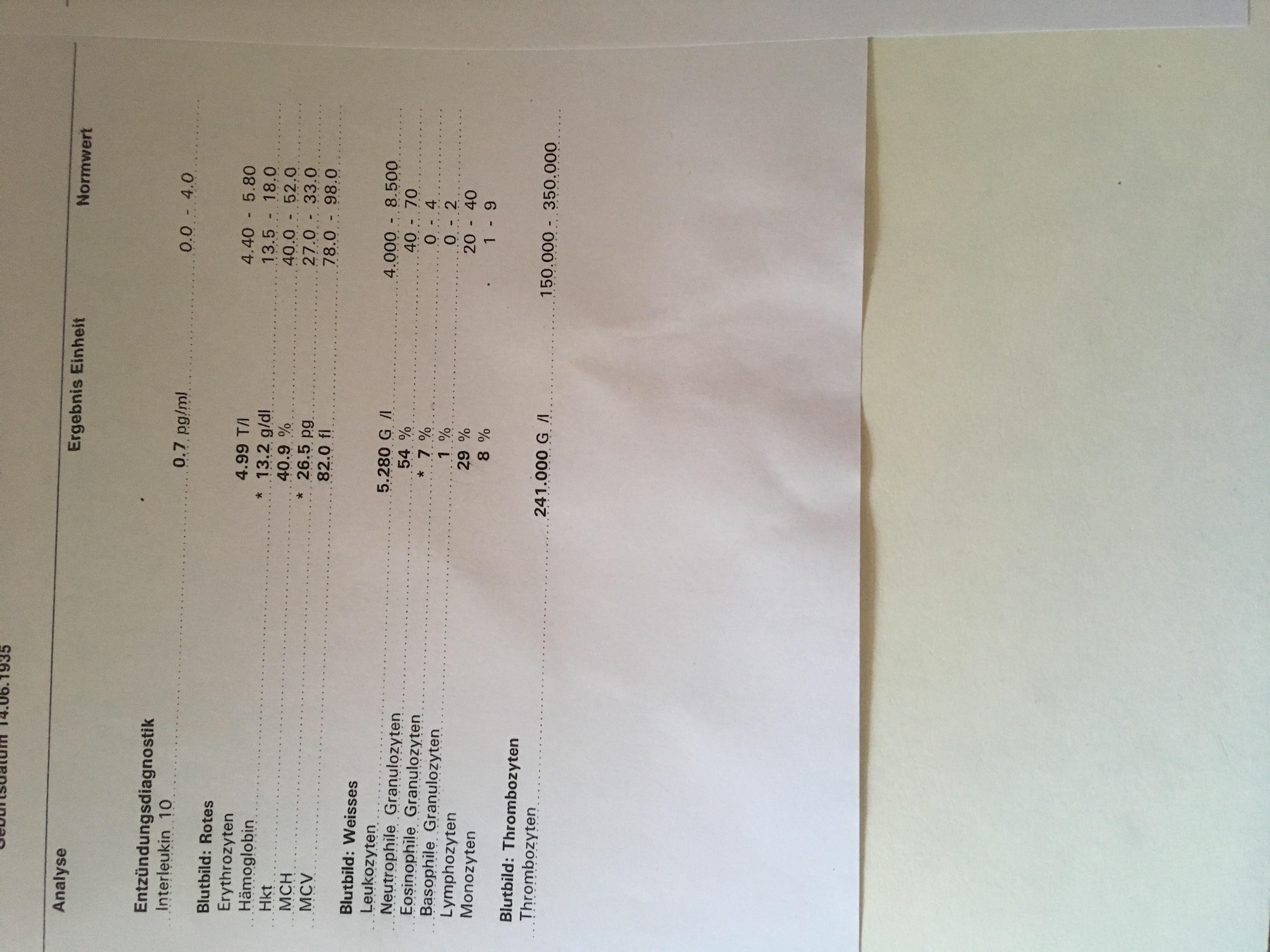 "H&H" sehr niedrig, spricht eigentlich für einen B12 - und/oder Eisenmangel oder starken Blutverlust in der letzten Zeit.