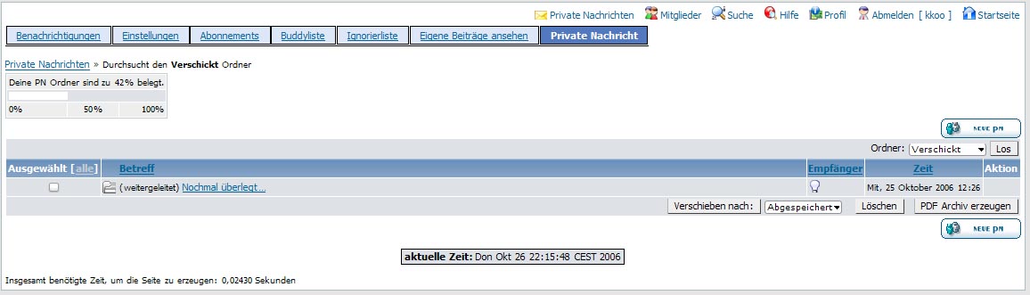 habe eine pn weitergeleitet, die liegt jetzt im ordner "verschickt", dann sollte doch da der empfängername stehen, oder? der steht da nämlich nicht, und jetzt weiss ich nicht, ob die nachricht verschickt wurde/angekommen ist.