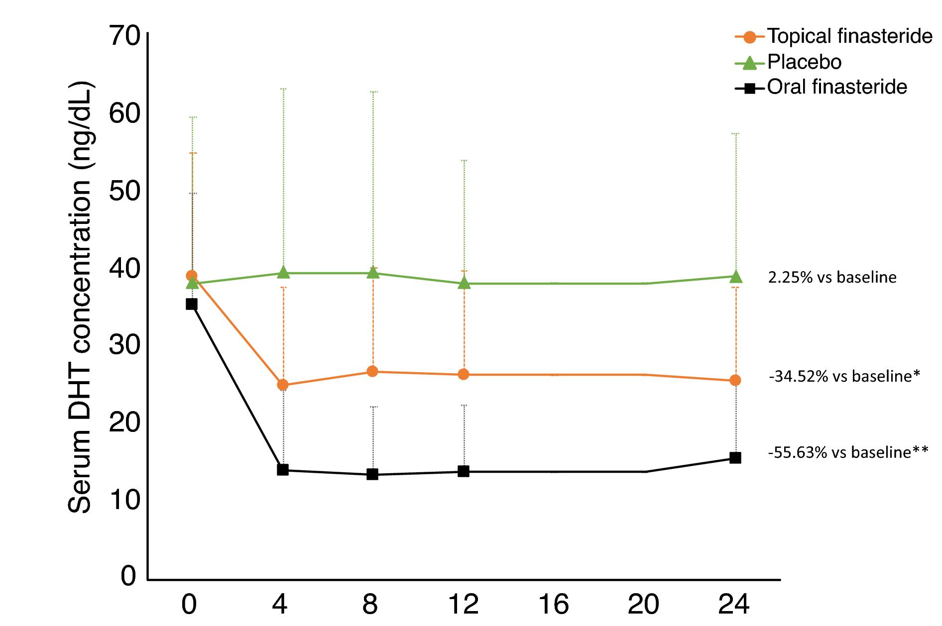 Die anderen untersuchten Lösungen 0.1% und 0.25% wirken auch systemisch und reduzieren das Serum DHT um 47% - 76%.