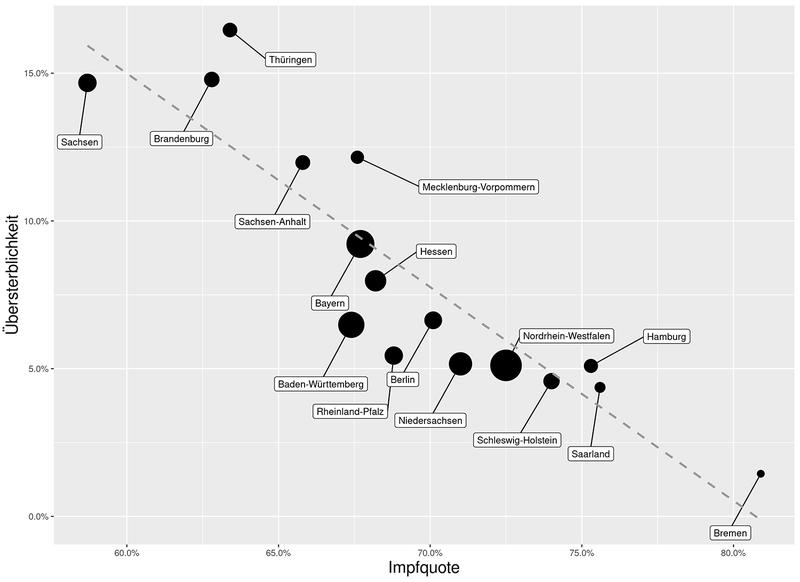 "Relevant ist, dass die Übersterblichkeit innerhalb der Bundesrepublik zwischen den Bundesländern stark schwankt. Es ergibt sich eine hochsignifikante negative Korrelation von -0,88 (gewichtete Betrachtung der Bundesländer nach Einwohnerzahl) bzw. -0,89 (ungewichtete Betrachtung der Bundesländer), d.h. dass mit einer hohen Impfquote eine vergleichsweise niedrige Übersterblichkeit einhergeht."