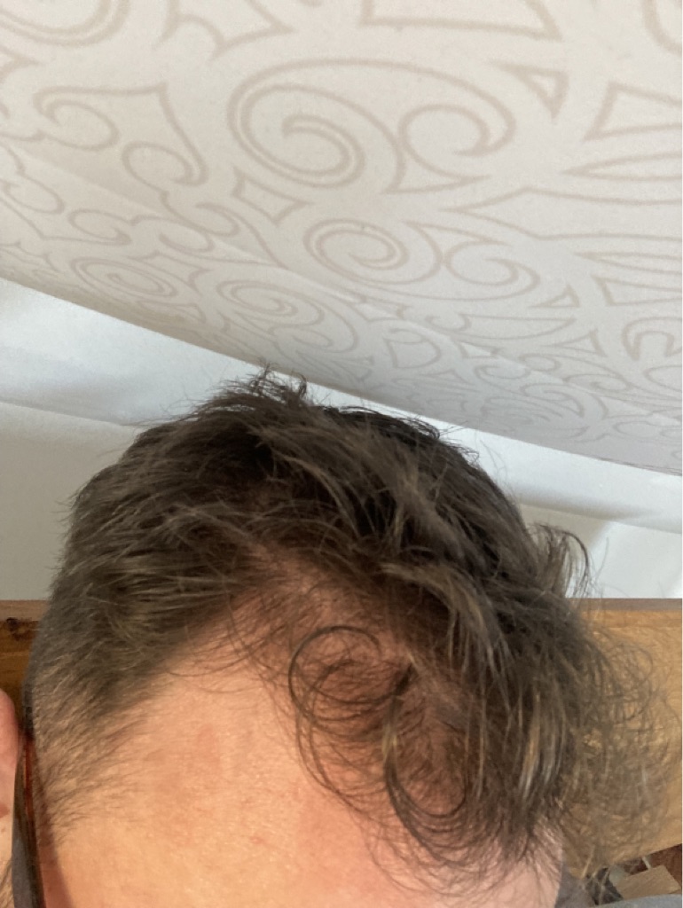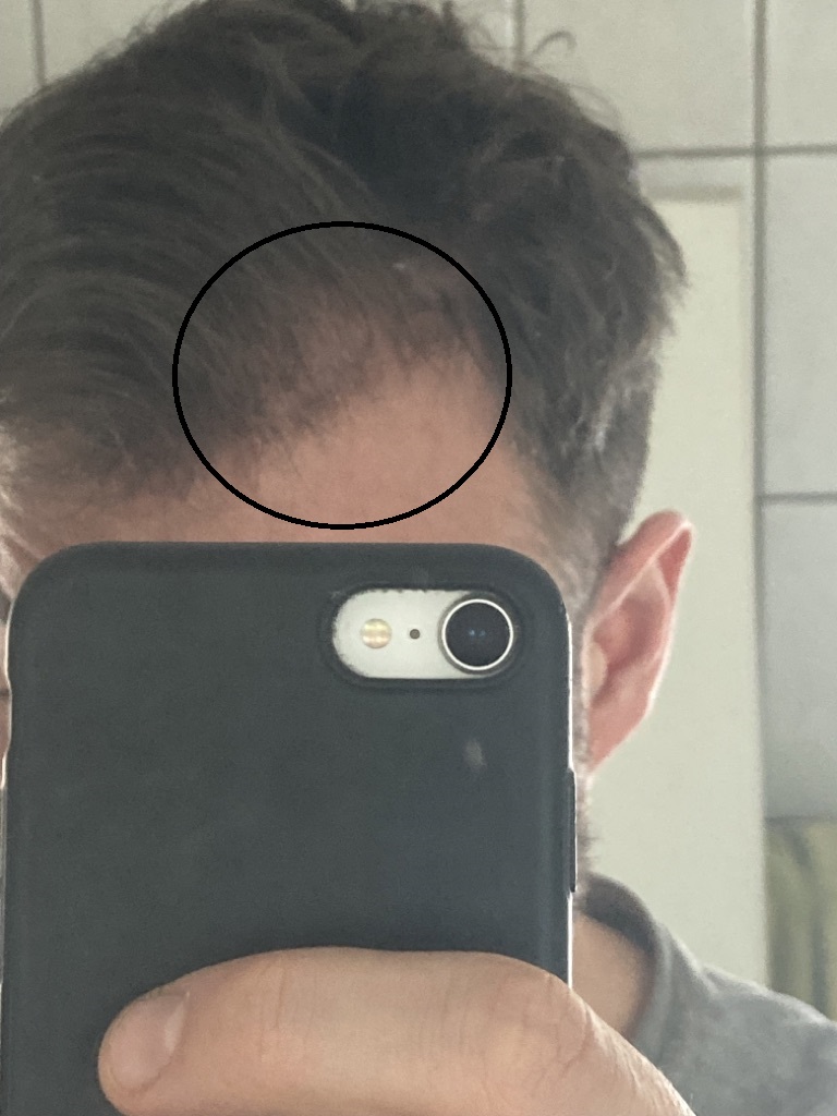 Mein Vater hat auch GHE die sich nie vergrößerten und darauf habe ich auch gehofft. Um dann irgenwann mit einer HT auffzufüllen. Leider entstehen seit ein paar Wochen/Monaten "Löcher" in den Geheimratsecken. Ich habe diese in den Bildern markiert.