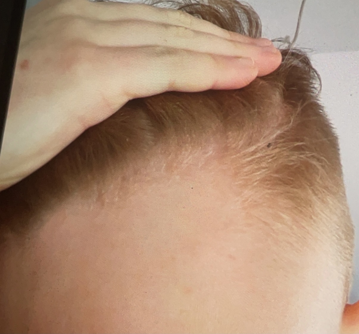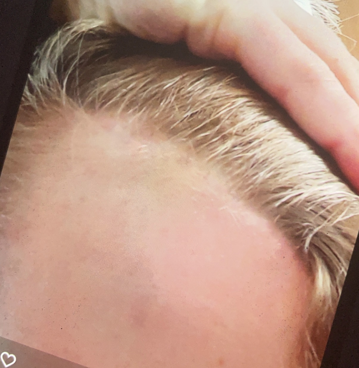 Das erkenne ich an der helleren Linie unter deinem Ansatz, die auch noch Flaum wachsen laesst. Da waren mal Haare.