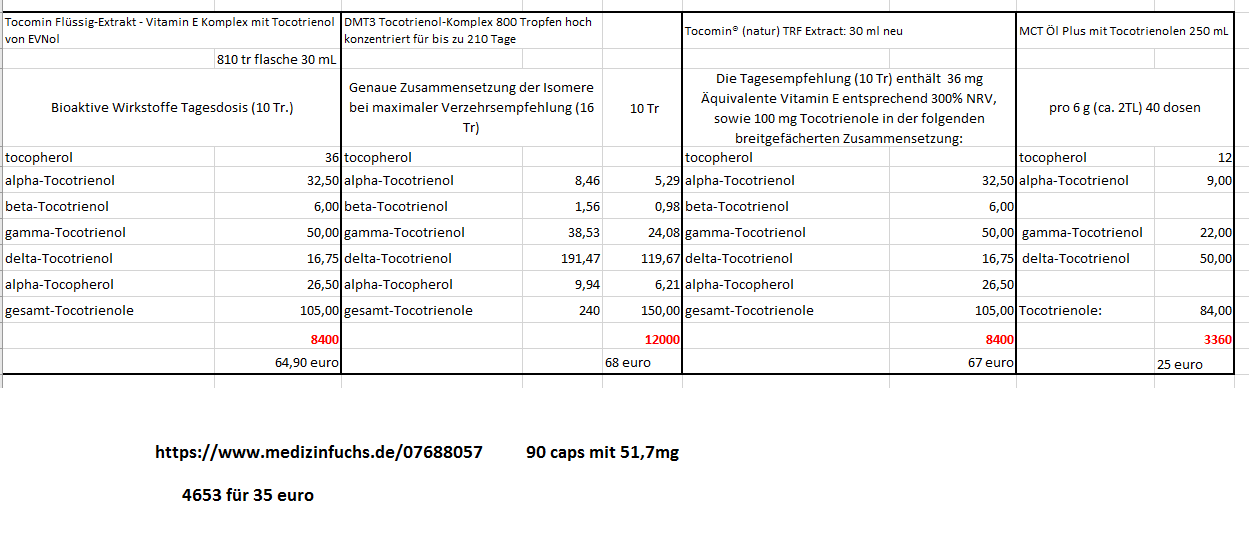 Soweit ich weiß hemmt Alpha Tocopherol die Aufnahme von Tocotrienole. Also Mischpräperate sind recht nutzlos. Ich nehme seit nem halben Jahr das von Swanson 50mg