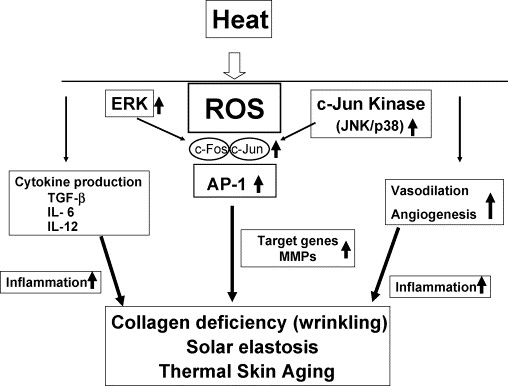 "Conclusion. ...(1) heat exposure to human skin stimulates the expression of MMP-1, MMP-3, and MMP-12. This increased expression of MMPs by heat will degrade the extracellular matrix proteins such as collagen and elastic fibers in human skin; (2) heat also regulates the synthesis of elastin and fibrillin, affects the formation of elastic fibers in human skin, and contributes to the development of solar elastosis; (3) heat regulates the production of many cytokines, including TGF-β, IL-6, and IL-12 and then, these cytokines regulate the expressions of extracellular matrix proteins in human skin; (4) heat is an important physical stimulus on human skin, just like UV, which can cause angiogenesis in human skin. Therefore, in addition to sunscreen, new strategies to block heat-induced skin aging (thermal aging) need to be developed to more effectively prevent skin aging "