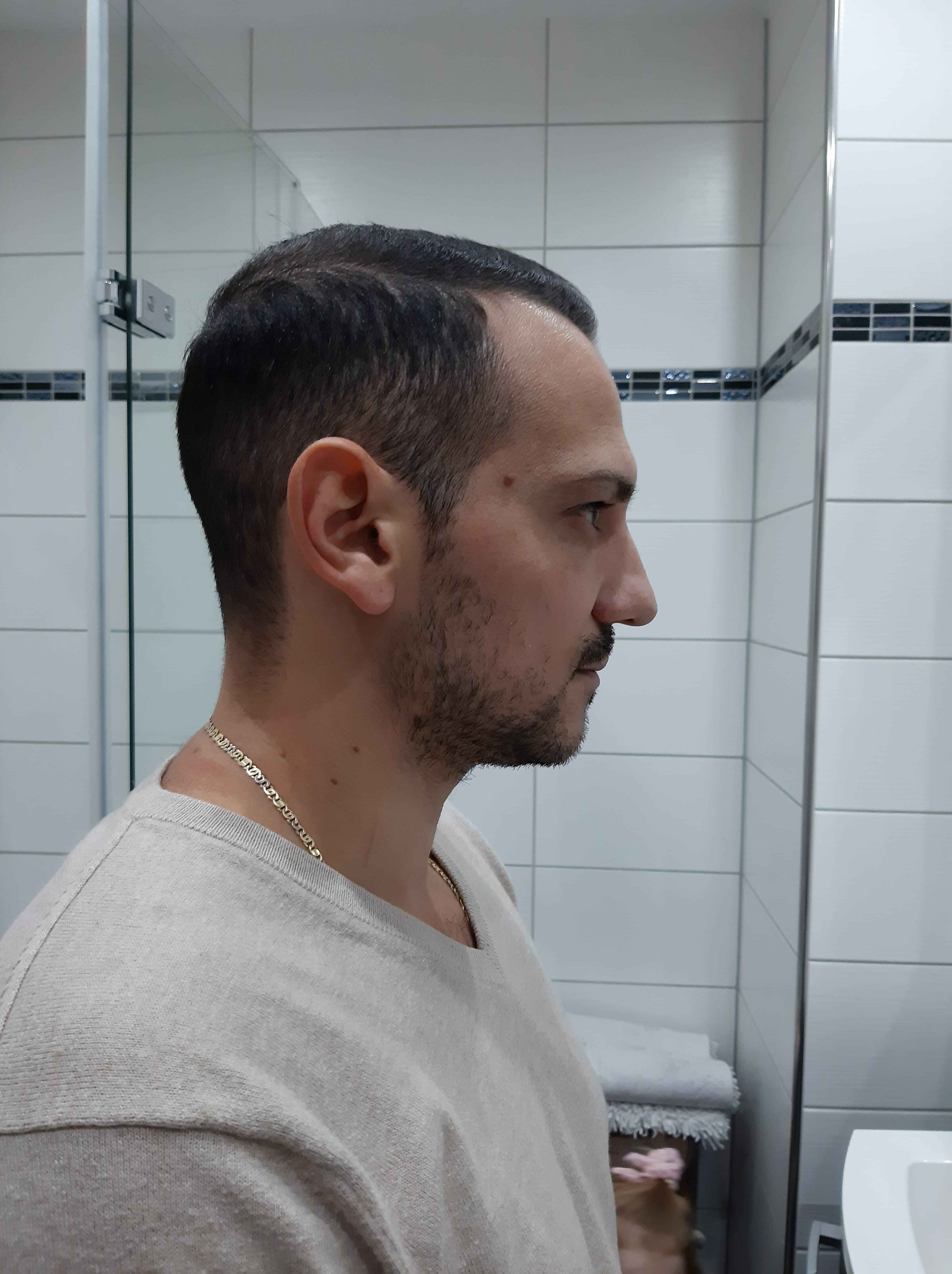 Hier ieht es so aus als ob die Haare am Scheitel noch weiter runtergerutscht sind. Das liegt jedoch daran, dass meine Frau dort immer ein Linie mit der Maschine auf 0 mm reinarbeitet.