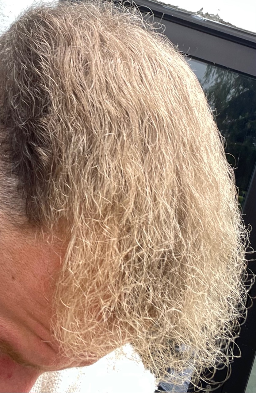 Die Haare sind jetzt soweit ganz okay. Geheimratsecken sieht man natürlich komplett, wenn die Sonne drauf scheint, selbst von vorne. Aber man kann nicht alles haben.