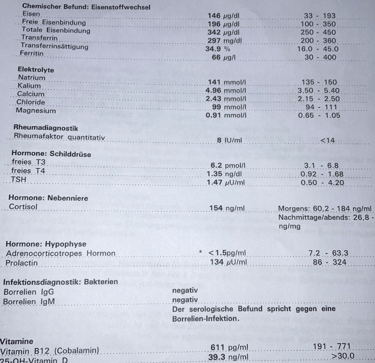 Ich hatte ja mal beschrieben- ACTH war letzten Herbst bei 1,5 (Norm 7,2-63). I ich fühlte mich meistens als wär ich bereits halb tot. Jetzt immer noch oft aber die Energie wird teilweise wieder mehr bzw die Erholung nach Stress jeglicher Art. Ich lade mal die aktuellen Blutwerte hoch, vllt kennt sich da wer besser aus. Ich finde es ziemlich verwirrend bzw teilweise sind die Werte paradox untereinander…