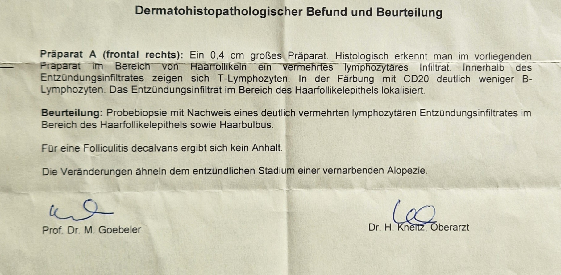 Ja würde abklären, ob es sich nun um scarring alopecia handelt und z.b. das erwähnte LPP oder nicht (z.b. diffuse arreata). Selbst da (LPP) gibt es Möglichkeiten, hatte einen (anekdotischen) Bericht gelesen, bei dem jemand mit LPP die Haare wiederbekommen hat, allerdings mit einer Kombination u.a. aus LLLT, Zyrtec, Otezla . Ich dachte eigentlich die Biopsie wäre genau das Mittel um es zu klären.