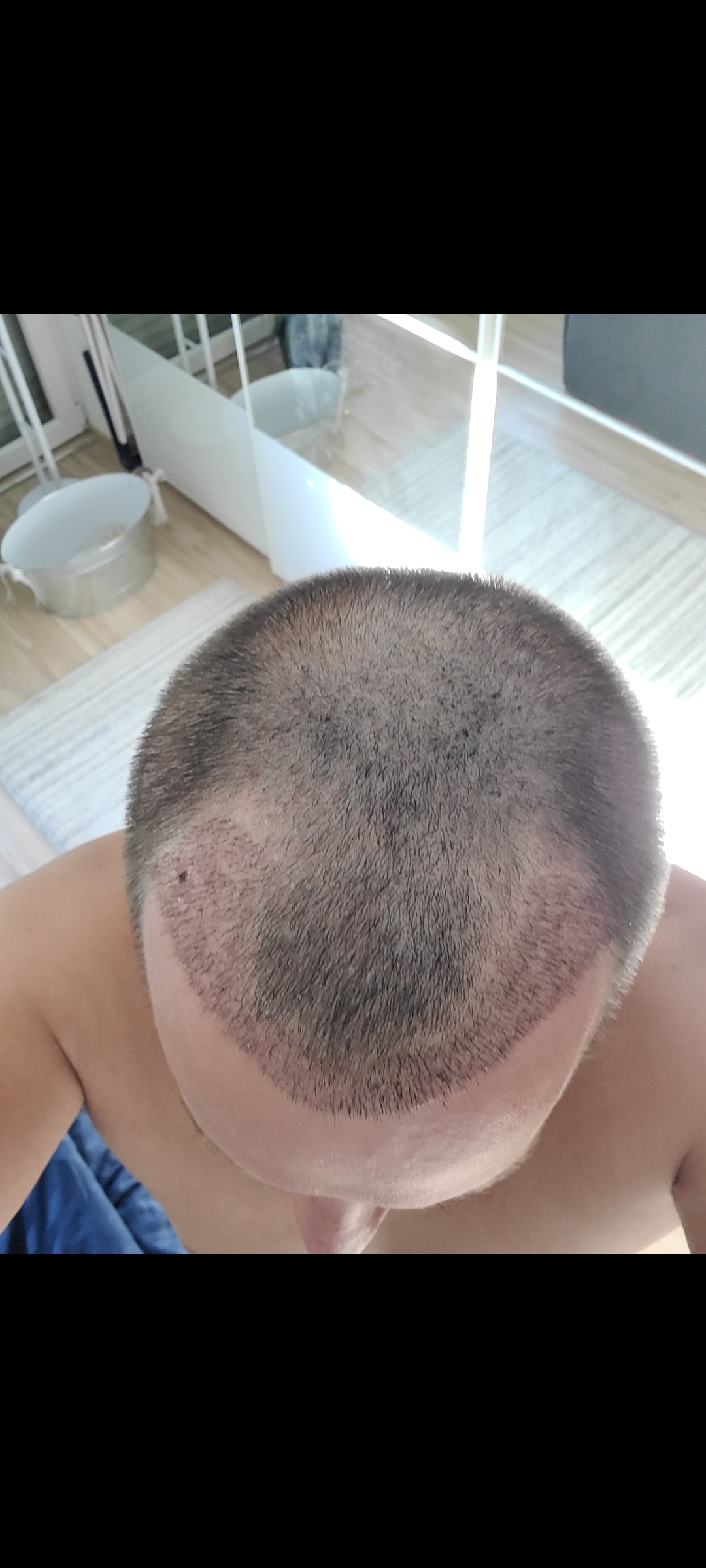 Ich bleib dabei, in den Ecken hinter den transplantierten Haaren ist der natürliche Haaransatz dünnerwerdend wodurch gerade bei kurzen Haaren ein Übergang deutlich zu sehen ist.