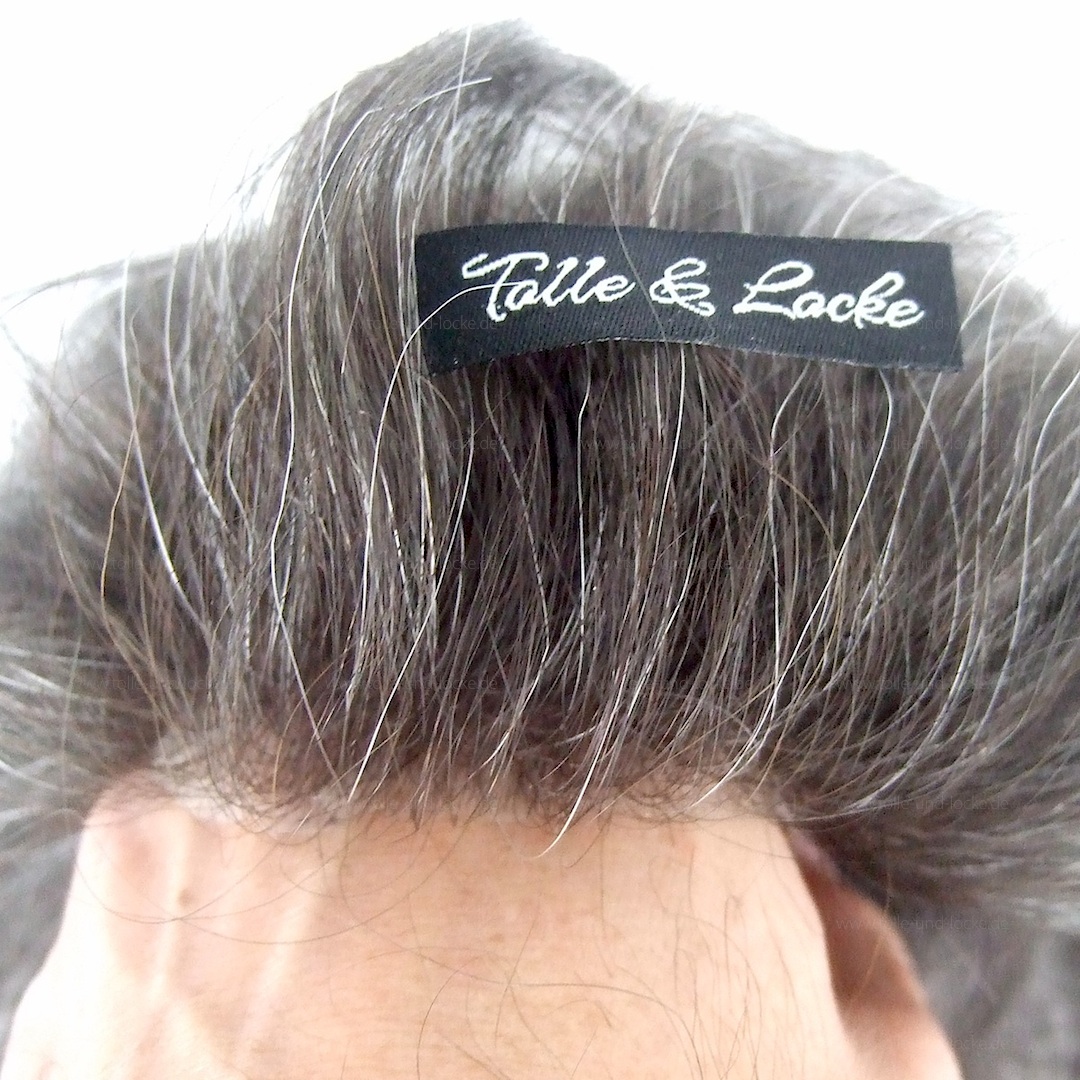 Sonderangefertigte Premium Stock Ware für einen Herren. Netz/Folien Kombination. Rund 80 % Grauanteil. (gering bis) Mittlere Haardichte mit (leicht) graduiertem, unregelmässigen Haaransatz.