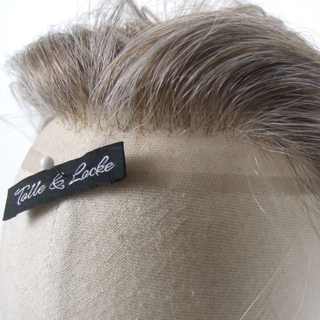 Individuell maßgefertigte Ware für einen Herren. Swiss Lace. Verschiedene Blondtöne. Unterschiedliche Grauanteile. Geringe Haardichte mit graduiertem, unregelmässigen Haaransatz.