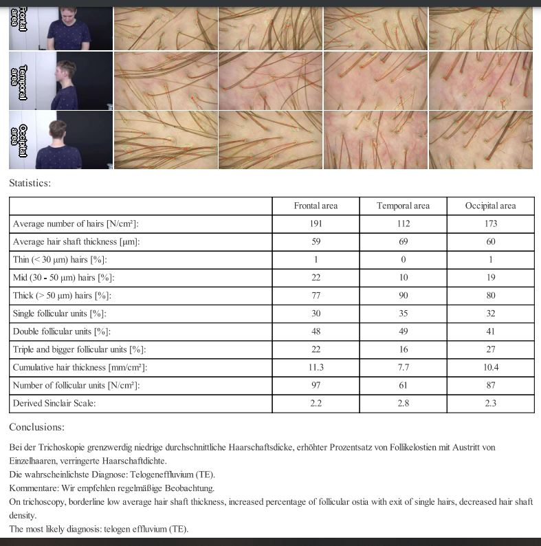 Dies war meine erste und einzige Trichoskopie. Hatte also keins vor der Finasteride. Etwa drei Monate später suchte ich einen anderen Arzt auf, um eine Haartransplantation durchzuführen. Während der Untersuchung erwähnte dieser neue Arzt eine gewisse Verkleinerung in meinem Spenderbereich. Ich zeigte ihm dann das Dokument, das die Möglichkeit von Telogen Effluvium nahelegte.