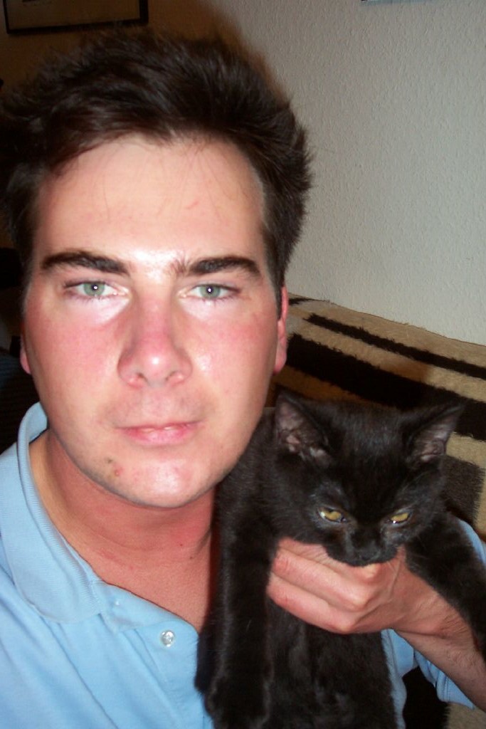 ein Foto aus dem Jahr 2004,als mich von einer schweren depressiven Episode erholt habe, trotz Fin und Minox. ich glaube, es war das schönste Jahr meines Lebens. 75 mg Clomipramin Retard 1 x tgl.haben mir damals eine vollständige Remission beschert. Leider auch den Höhepunkt meiner Unsportlichkeit, bzw. war das Medi eigentlich nicht daran schuld, sondern ich. Zum Kraftsport kami ch esrst 2 jahre später so wirklich. Auf dem Foto sind die Haare dunkelbraun gefärbt inkl.Augenbrauen. Ich war da 24 Jahre alt und halte meinen geliebeten Kagter Salem auf den Schultern (als Baby noch). Meine Augenfarbe ist echt (ich weiss,selten, grau-grün - aquamarin). Naturhaarfarbe dunkelblond.