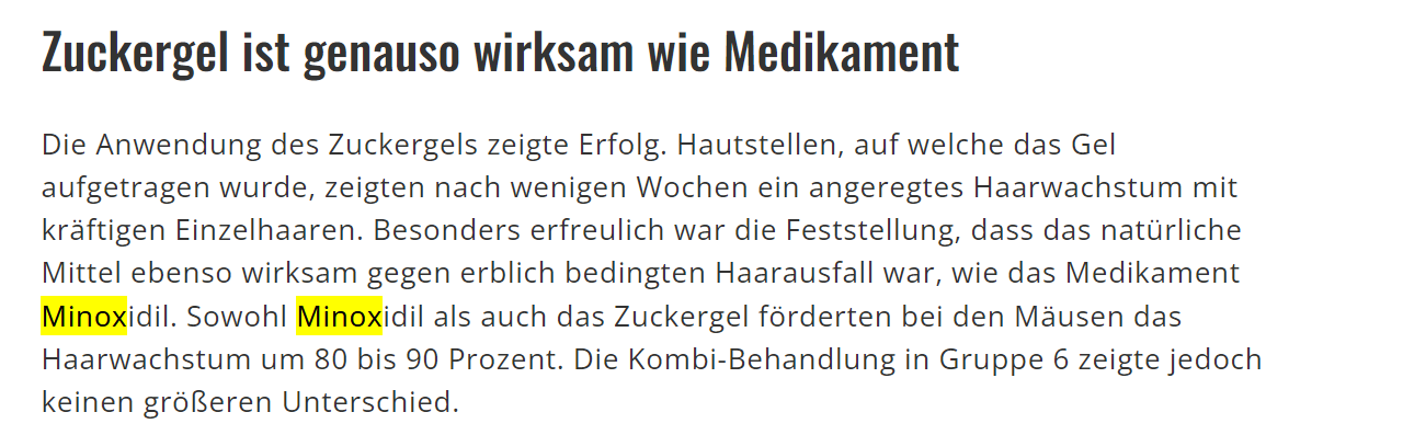 Interessant dann wirkt es also auf ähnlichem Wirkmechanismus wie Minox? Wenn die Kombination nichts gebracht hat. Normalerweiße hat man ja bei Aga wenn man mehrere verschiedene Wirkmechanismen kombiniert bessere Erfolge. Aber trotzdem ein Vorteil wenn man dasuech tatsächlich Minox ersetzen könnte und somit keine Angst mehr vor den Nw haben bräuchte. Solange dieses Zuckergel selber keine nw hat.