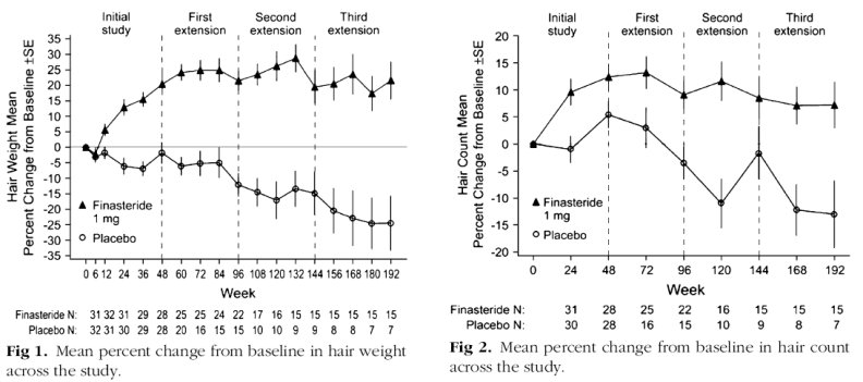 Nachdem haarerkrankungen.de heute per Newsletter darauf hingewiesen hat, dass im Juli eine Vierjahresstudie zu Finasterid und Haargewicht veröffentlicht wurde, hier zwei Grafiken aus dieser Studie:
