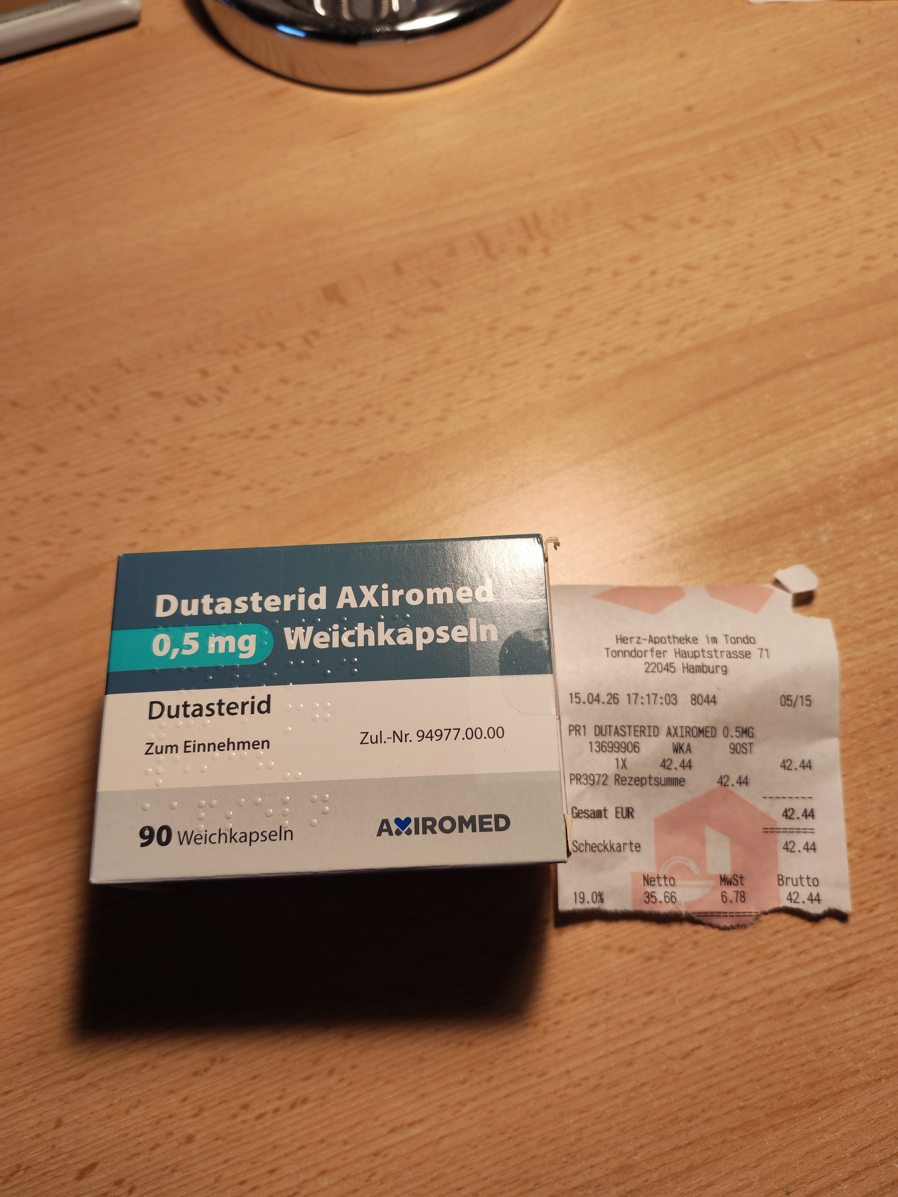 Hab damals und seither immer abgegeben, dass ich Dutasterid schon ne Weile Off-Label nehme, bloß ein Folgerezept brauche, keine Nebenwirkungen habe...