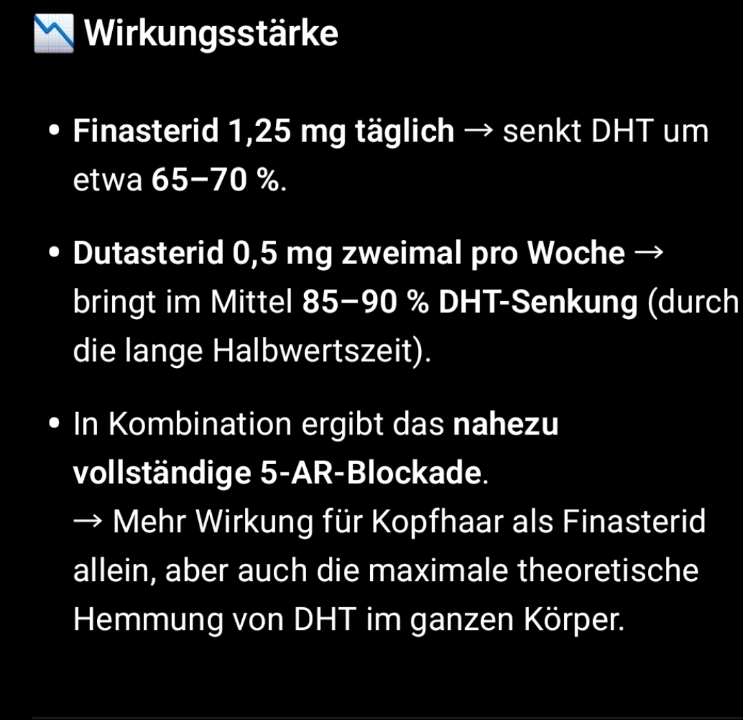 Folgendes sagt wieder die KI aufgrund klinischen Studien und Metaanalysen, die die DHT-Senkung, Wirksamkeit beim Haarwachstum, Wirkeintritt und Nebenwirkungsrate von Finasterid täglich versus Dutasterid täglich bzw. 3× pro Woche vergleichen.