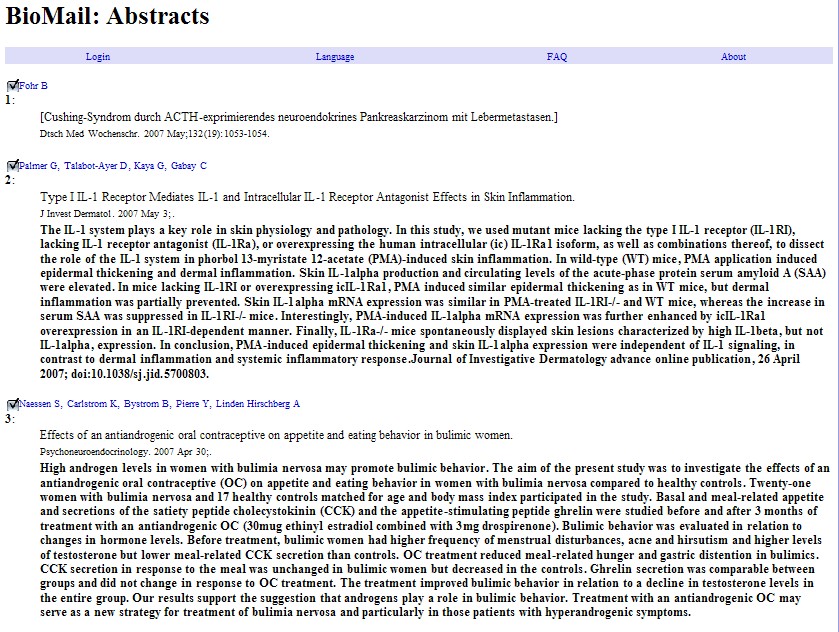 ah so, cool. einziger nachteil den ich da sehe wäre dass man dann auch abstracts bekommt die man eigentlich nicht möchte, bei dem biomail kann man die kopfzeilen ankreuzen und dann die abstracts sich anzeigen lassen.