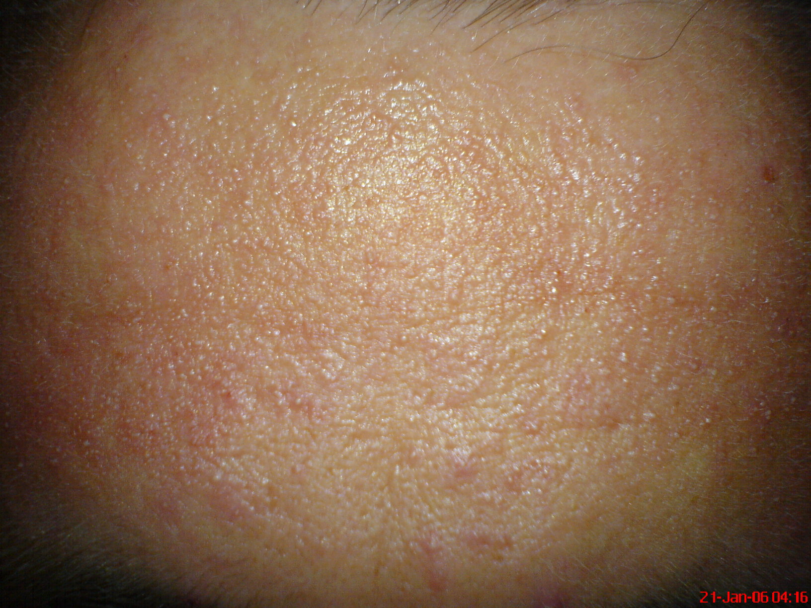 am morgen nach der zweiten anwendung war meine stirn voll von winzig kleinen eiterpickel. bei 2 meter abstand waren diese garnicht mehr zu erkennen so klein waren die. aber wirklich die komplette stirn. ich habe euch mal vorher nacher bilder gemacht. also einmal meine stirn wie sie vorher irgendwann mal war und meine stirn wie sie am tag des auschlages war. der ausschlag ist dann etwa 1-2 tage geblieben, und jetzt trocknet meine stirnhaut voll aus. die schählt sich !