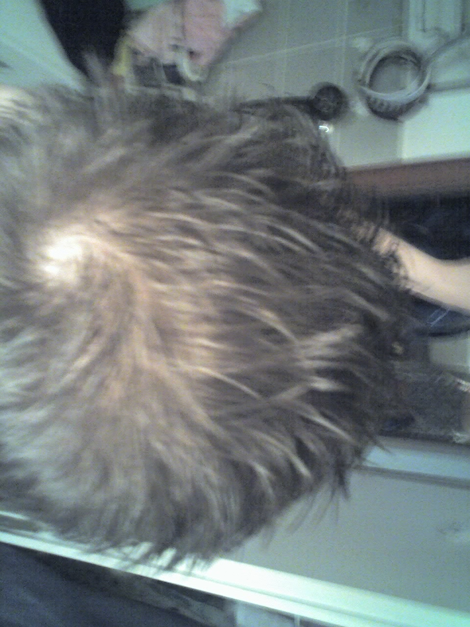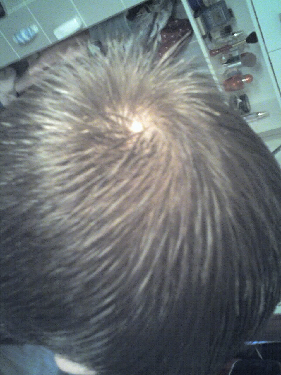 Am Hinterkopf, wo die Wirbel sind fühlt sich das Haar dünner an.