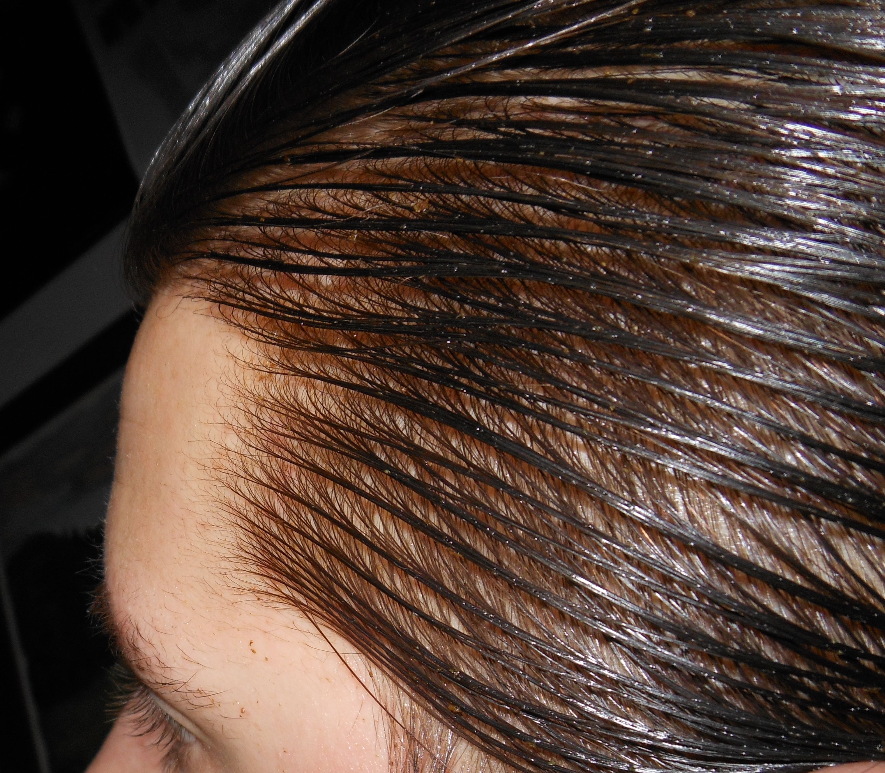 Anbei mein aktueller Haarstatus an den Seiten. (über den Schläfen) und ein allgemeines Bild zur Haardichte mittendrin (die überall noch gleich hoch ist, außer am Ansatz) Was denkt ihr, NW1? Rechts geht es ganz leicht in die Ecke rein und links ist es fast gerade zur Stirn... Wundert euch bitte nicht über den schleimigen "look", da hab ich gerade Bockshornkleeöl drin