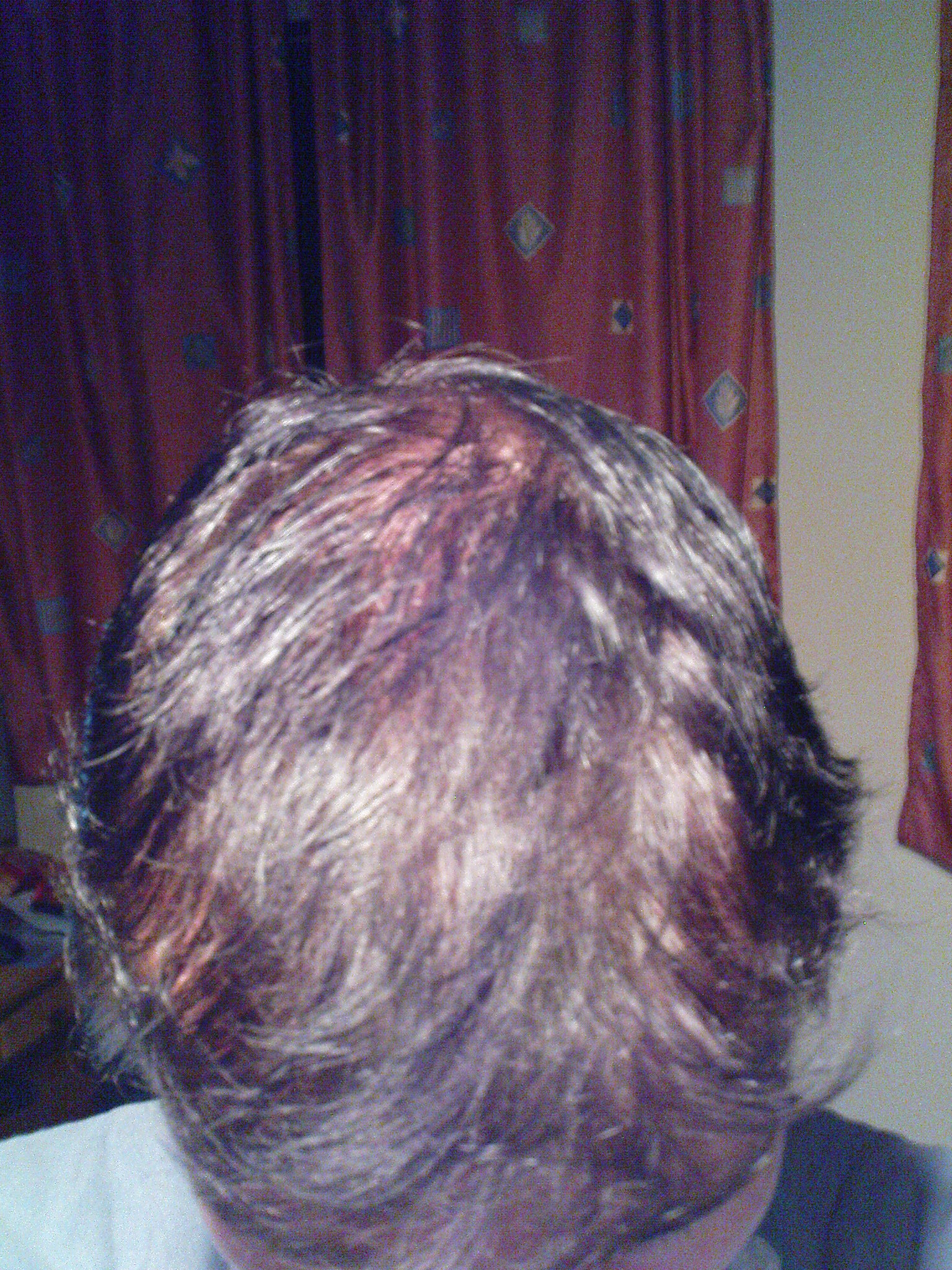 Und das ist etwa 1 1/2 Monate alt, da sind die haare feucht, daher sieht man natürlich die kopfhaut ein wenig (von oben konnte man allerdings noch nix sehen nur an den etwas kürzeren seiten), aber so wie es da ist eigentlich normal.