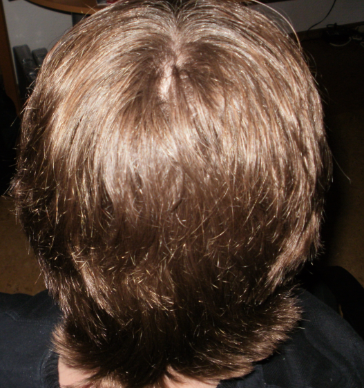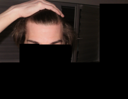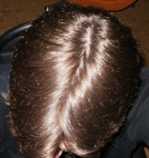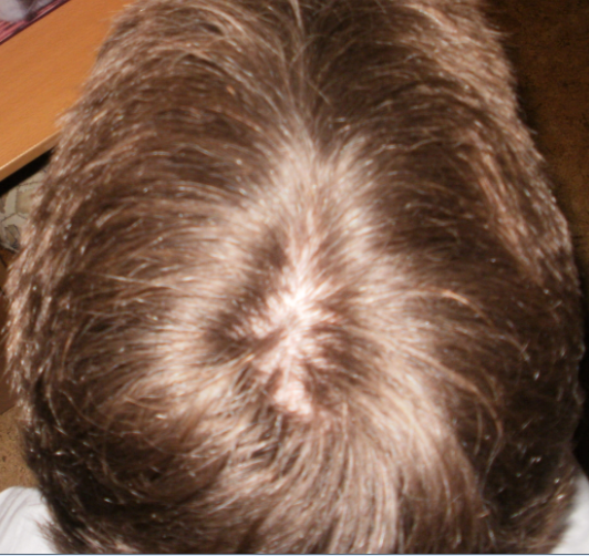 Derweil sieht der Haarwuchs insgesamt noch normal und recht voll aus, lediglich der Wirbelbereich hinten wirkt ein bisschen weniger dicht.