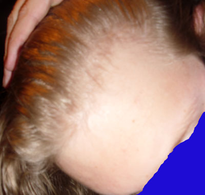 Haarlinie wie sie im Juli 2011 war ist in flaumform sichtbar .. das heisst viele Haare aber sehr kurz (5 mm) .. wenn die länger werden wäre die front blickdicht.