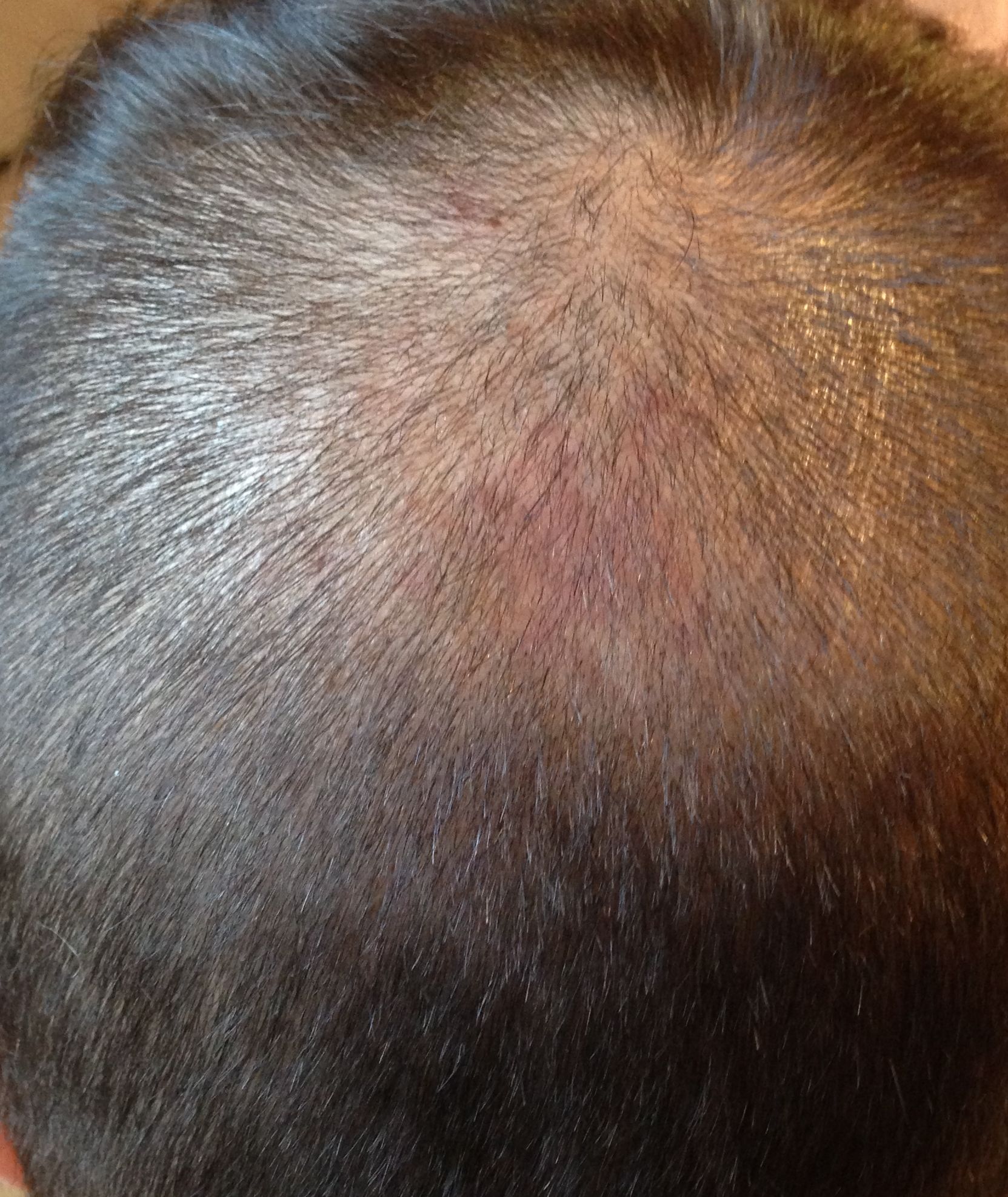 kreisrunder roter fleck---> rot schwächte ab die tage und man sieht auf der kopfhaut am hinterkopf irgendwie punkte auf der haut .