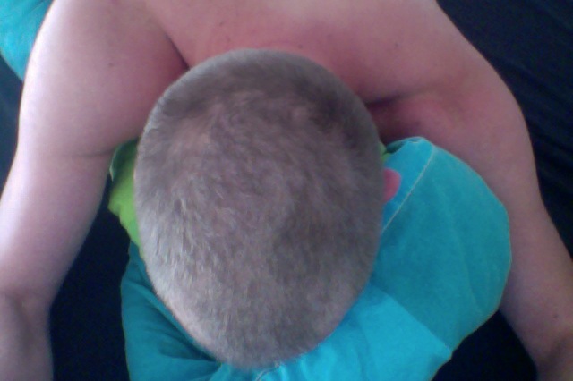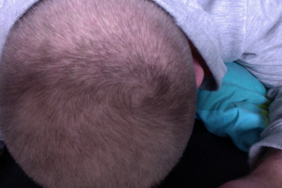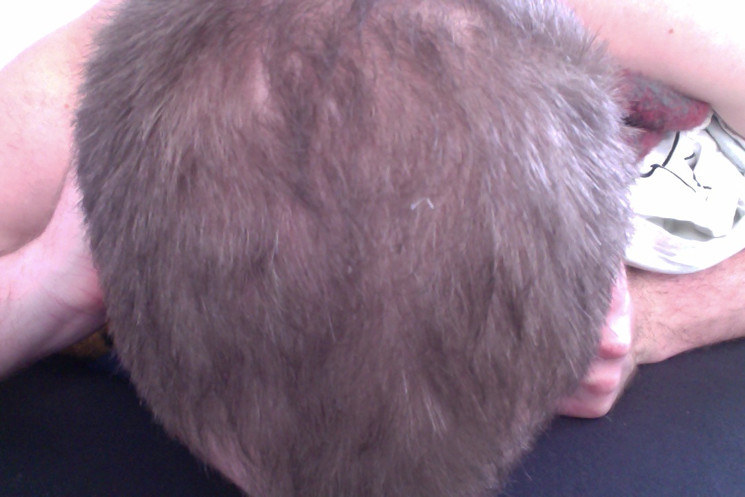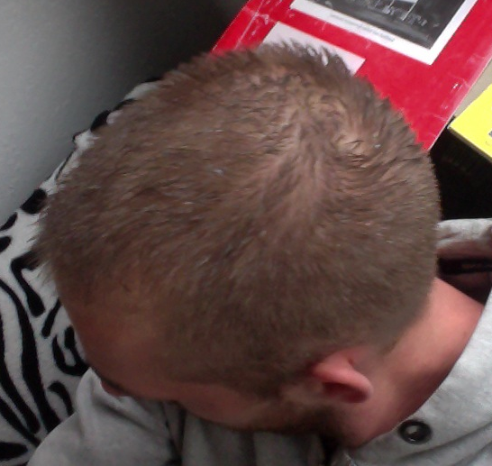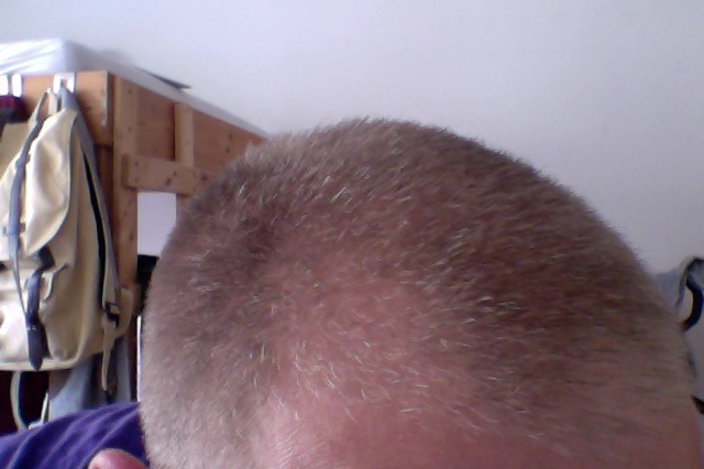 hier sieht man jetzt einigermaßen die hellen/blonden haare, die ich vorher mit der kamera so schlecht dokumentieren konnte. besonders gut sieht man die in den beiden angeschlagenen ecken, sind aber in der fülle auf dem gesamten oberkopf verteilt.
