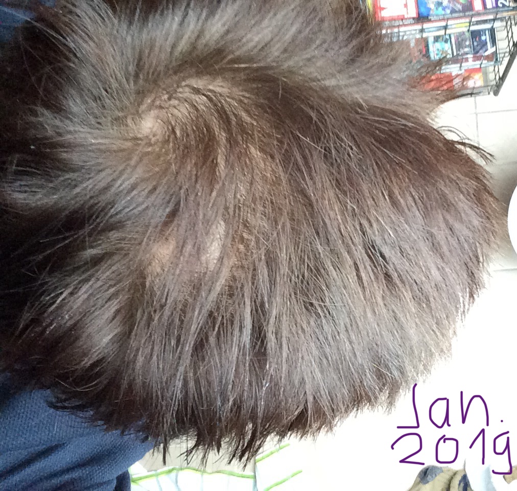 Dann gab es ca im April oder Mai 2019 bis heute ein kleines Erfolgserlebnis. Die lichten Wirbel am Hinterkopf, die über 18 Jahre lang hauptsächlich nach dem Haarewaschen, geradezu unvorteilhaft hervorstachen ( egal bei welcher Länge), hatten sich minimalst verbessert!