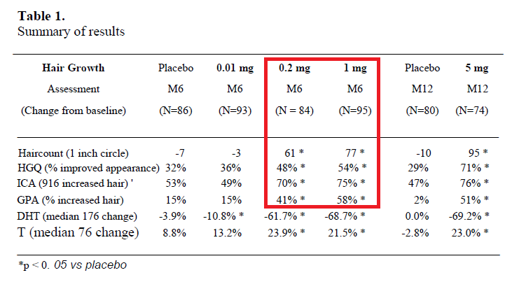 Von einer "fast gleichen" Wirkung von 1 mg und 0,2 mg kann also nicht gesprochen werden. Vielleicht in Bezug auf die DHT-Suppression, aber nicht in Bezug auf das tatsächliche kosmetische Ergebnis, worauf es ja ankommt. Eine weitere Studie* bestätigt dies (Statistik Anhang 2).