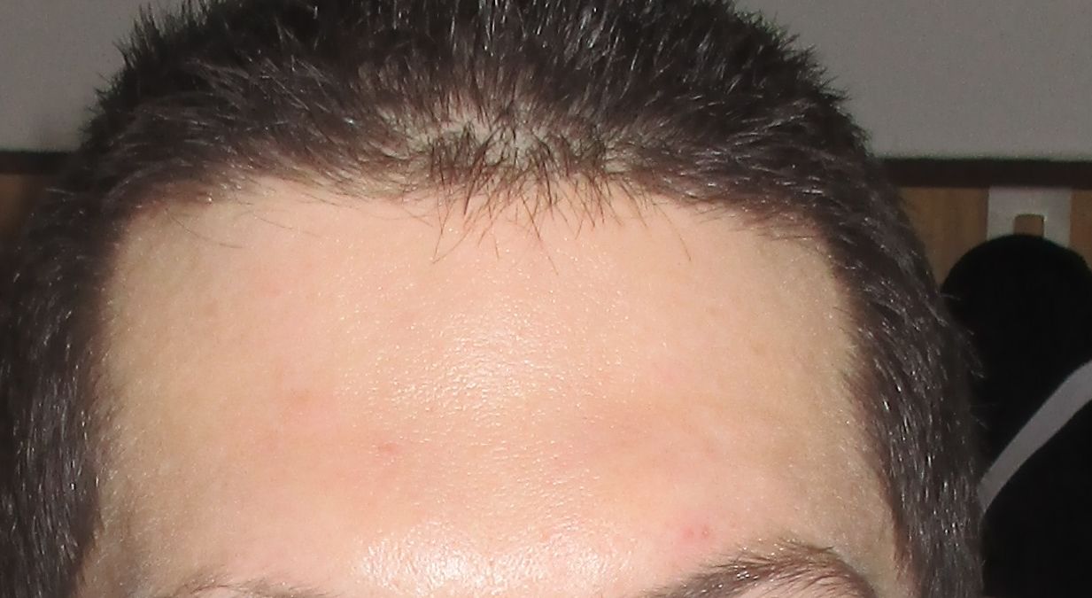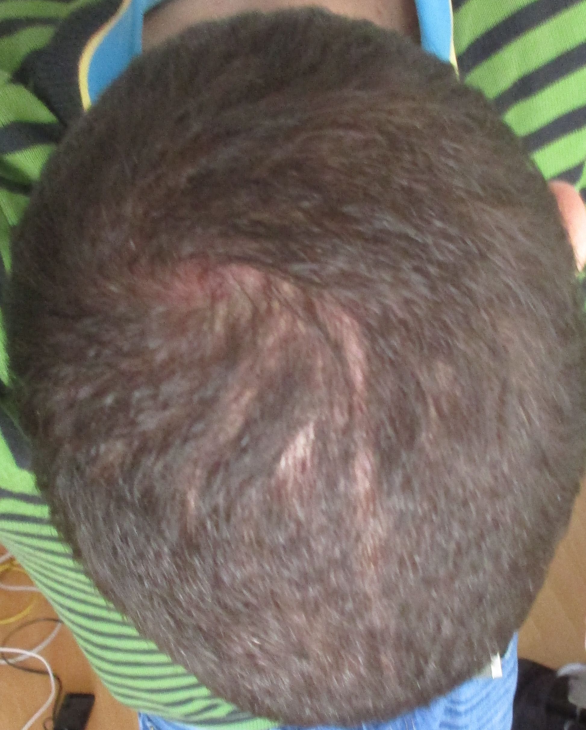 Trotz der selbst bei Tageslicht gut sichtbaren Tonsur bleibt aber meine größte Sorge der Haaransatz. Ich habe schon eine riesige Stirn, so dass ich mir da eigentlich keinen Verlust erlauben kann. Ausserdem sieht man auf den Bildern sehr "schön" die Ausdünnung direkt hinter der Front.