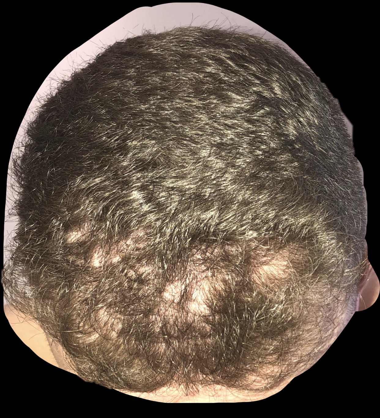 Junge, dass da was nicht passt ist offensichtlich. Betrifft aber hauptsächlich die Front. Hatte schon überlegt, ob das evtl. noch irgendwie mit einer großen Zahl an Haarwirbeln zusammenhängen könnte, aber dieses Foto zeigt besonders gut, wie scheckig das Haarausfallmuster ist. Versuch's vielleicht echt mal beim Nuklearmediziner wie zuvor angeraten.