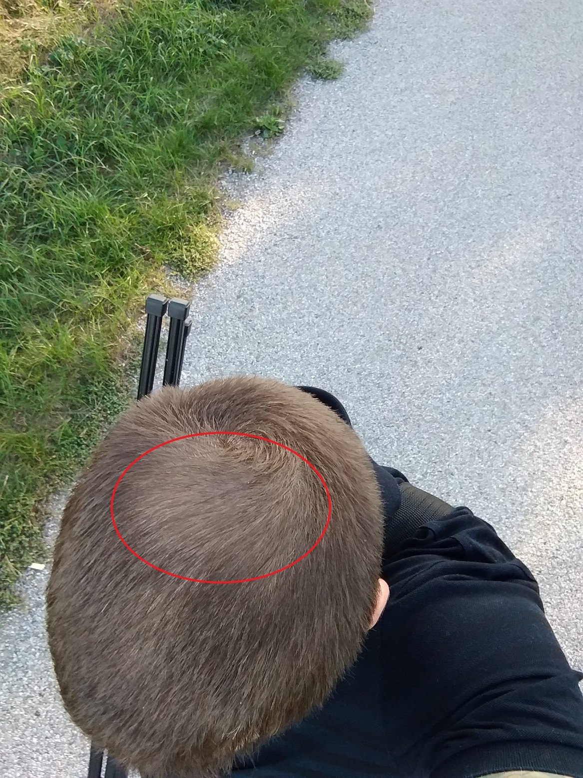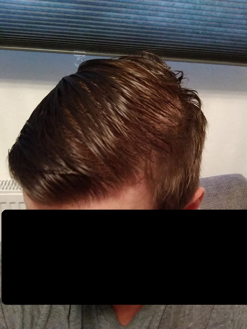 Ich habe keine einzig kahle Stelle. Nur die Haare dort hinten sind halt seit Jahren in dem Zustand, unverändert. Sie werden nicht weiter dünner aber auch nicht dicker.
