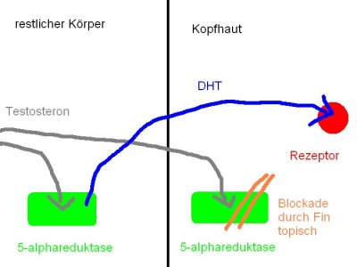 Ohne Medikamente ist es so, dass Testosteron über den Blutweg in die Zielzellen gelangt. Dort wird es in Geweben wie der Haut (auch in der Haarwurzel), in der Prostata und in der Leber durch das Enzym 5-alpha-Reduktase zu Dihydrotestosteron (DHT) umgewandelt. Dieses DHT bleibt aber nicht im dortigen Gewebe und wird dort "verbraucht", sondern Teile gelangen wieder in die Blutbahn. So kann das DHT, welches z.B. in der Leber gebildet wurde, in die Kopfhaut gelangen.