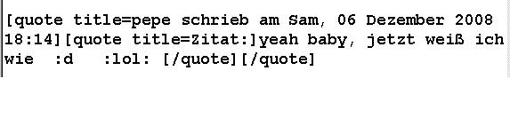 Re: Zitier-Test [Beitrag #143770 ist eine Antwort auf Beitrag #143769] :: Sa., 06 Dezember 2008 18:14 Zum vorherigen Beitrag gehenZum nächsten Beitrag gehen