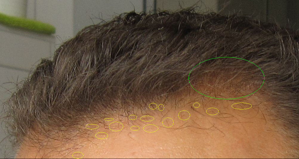 Ich habe noch ein paar neue Einzelhärchen in den Randzoneen in gelb markiert. Da kommen aber noch viel mehr, man sieht es auf dem leider Foto nur unzureichend.