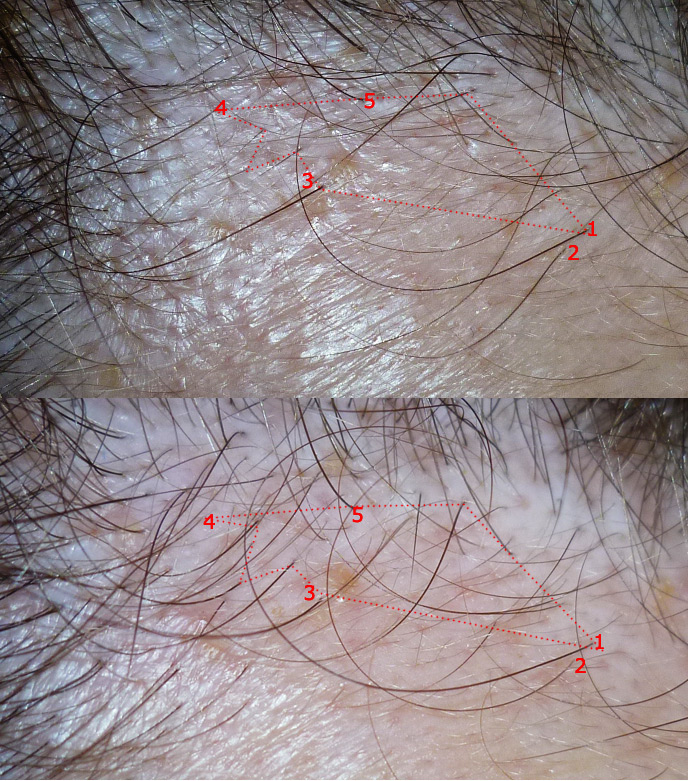 Bei den Bildern mit den Markierungen sehe ich jetzt auch keinen signifikanten Unterschied. Dafür wirkt der Haarlinienstatus auf den Bildern der Datei comp.jpg aber eigentlich sehr gut, besonders auf der einen Seite, wo es gar nicht nach GHE aussieht. Falls die Haare bei dir insgesamt nicht ausdünnen und du keinen erhöhten Haarausfall über längere Zeiträume hast, dann würde ich mal sagen, du hast maximal ne kleine GHE auf der einen Seite und ansonsten kein Haarproblem. Kannst dir ja ein bisschen Spiro dahinschmieren, aber Fin würde ich in diesem Fall auch erstmal nicht nehmen. Dein Arzt ist da wirklich zu loben.
