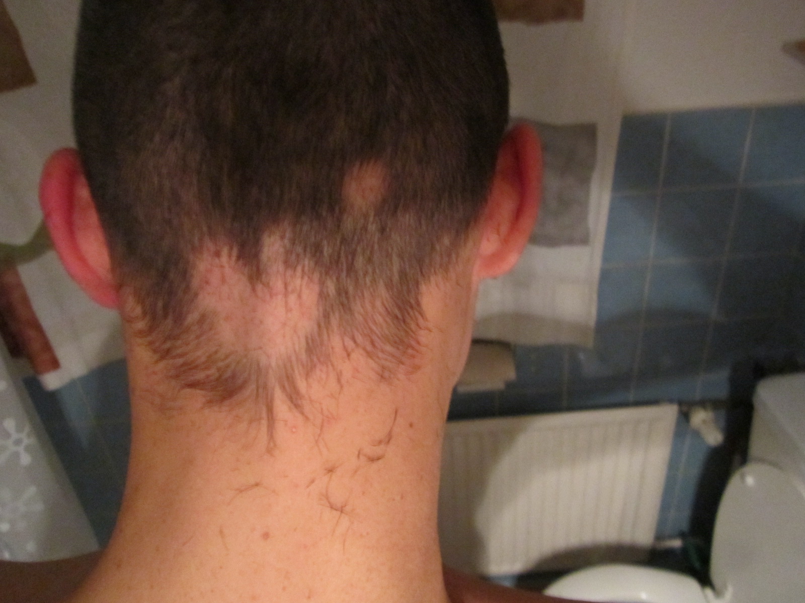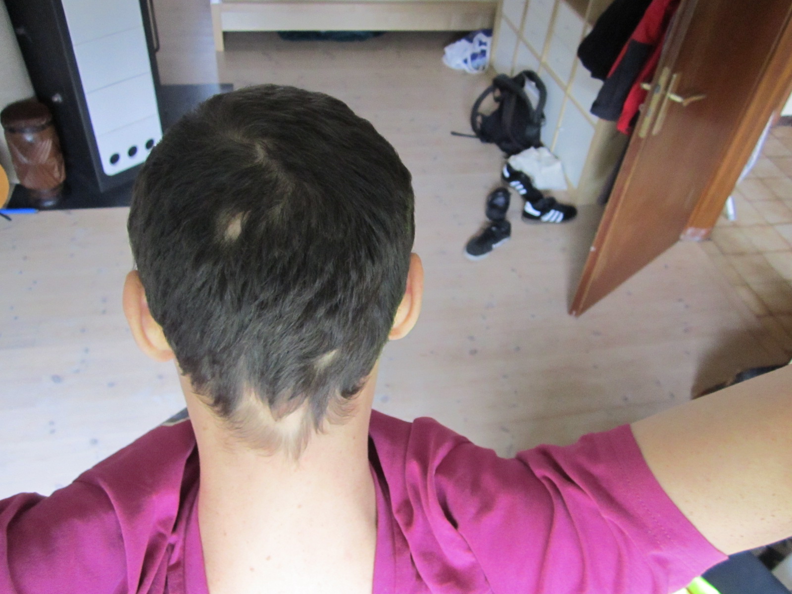 So, die Bilder haben etwas gedauert, aber jetzt sind sie da. Das erste Bild ist vom 17.10.11. Das zweite Bild vom 19.10.11, nachdem ich mir die Haare kurz rasiert habe. Seitdem ist es recht schnell "bergab" gegangen